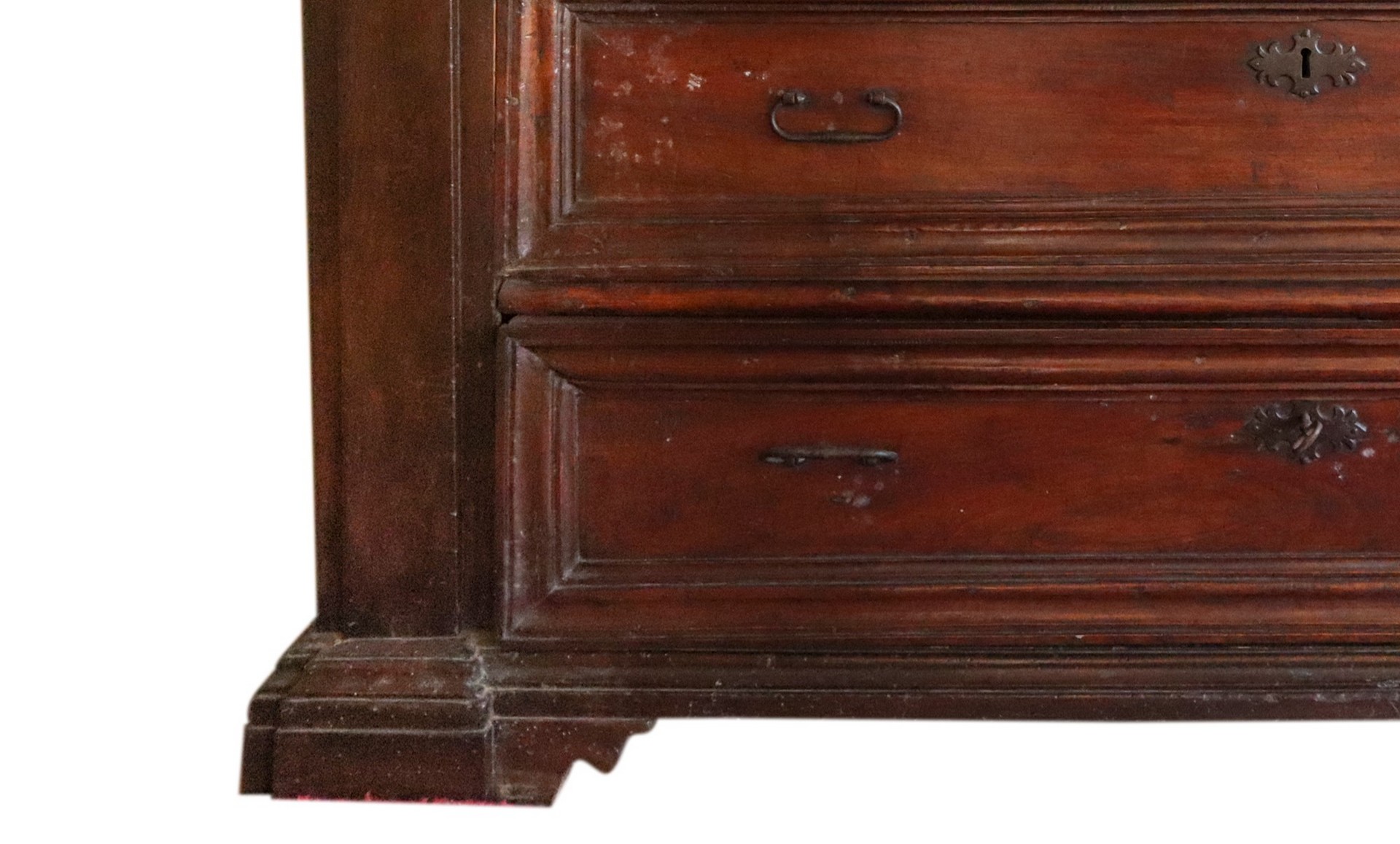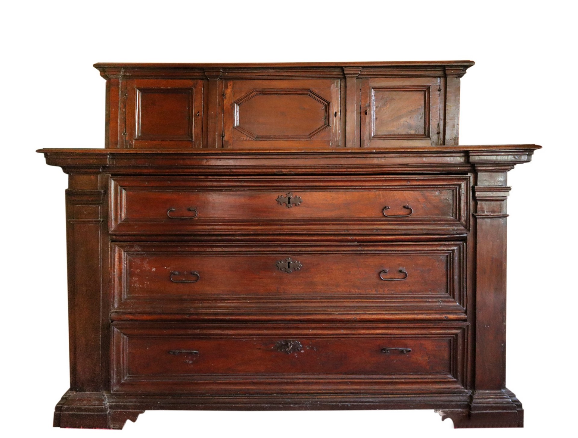 Mobile da sagrestia in legno di noce, 17° secolo h cm 155, h base 110 x L cm 180 x P cm 70A tre cassetti, con alzata portante tre sportelli, manigliera in ferro e piedi a mensola.A tre cassetti, con alzata portante tre sportelli, manigliera in ferro e piedi a mensola.