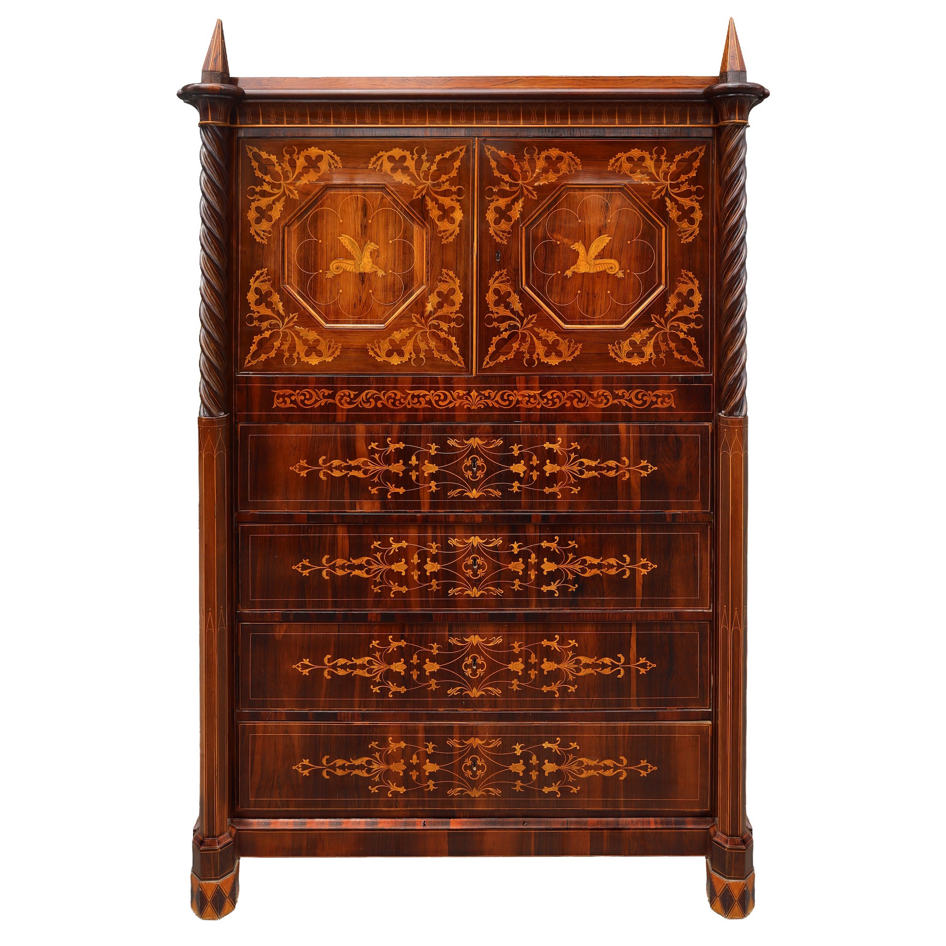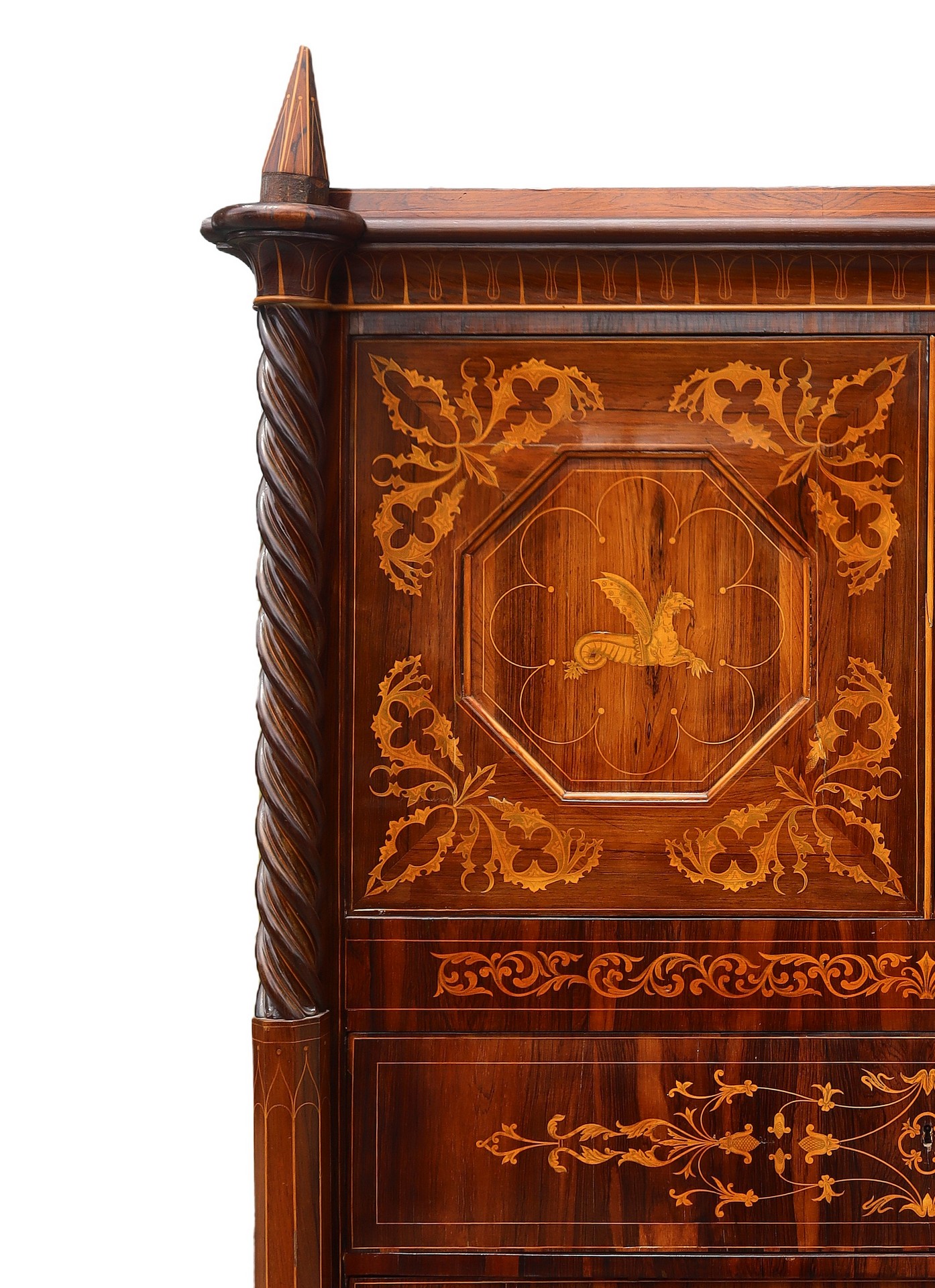 Chiffoniera intarsiata in legno di palissandro, 1820h cm 200 x l cm 130 x p 60Con intarsi in legni chiari nello stile neo-gotico. Sicilia. Corpo unico. Colonne Tardorali a torchon. 4 cassetti alla base + 2 sportelli superiori. Al''interno 9 piccoli cassettiCon intarsi in legni chiari nello stile neo-gotico. Sicilia. Corpo unico. Colonne Tardorali a torchon. 4 cassetti alla base + 2 sportelli superiori. Al''interno 9 piccoli cassetti