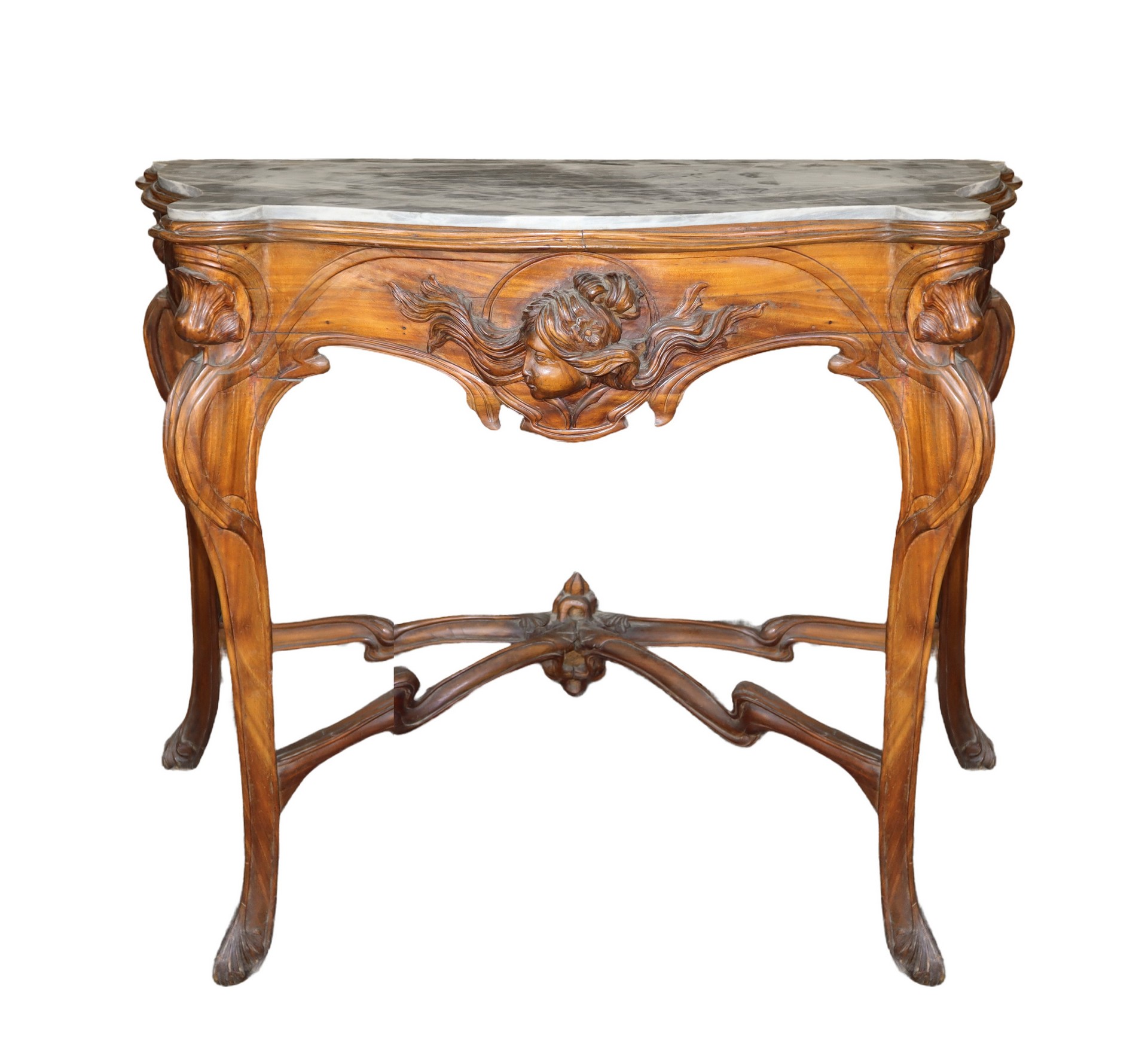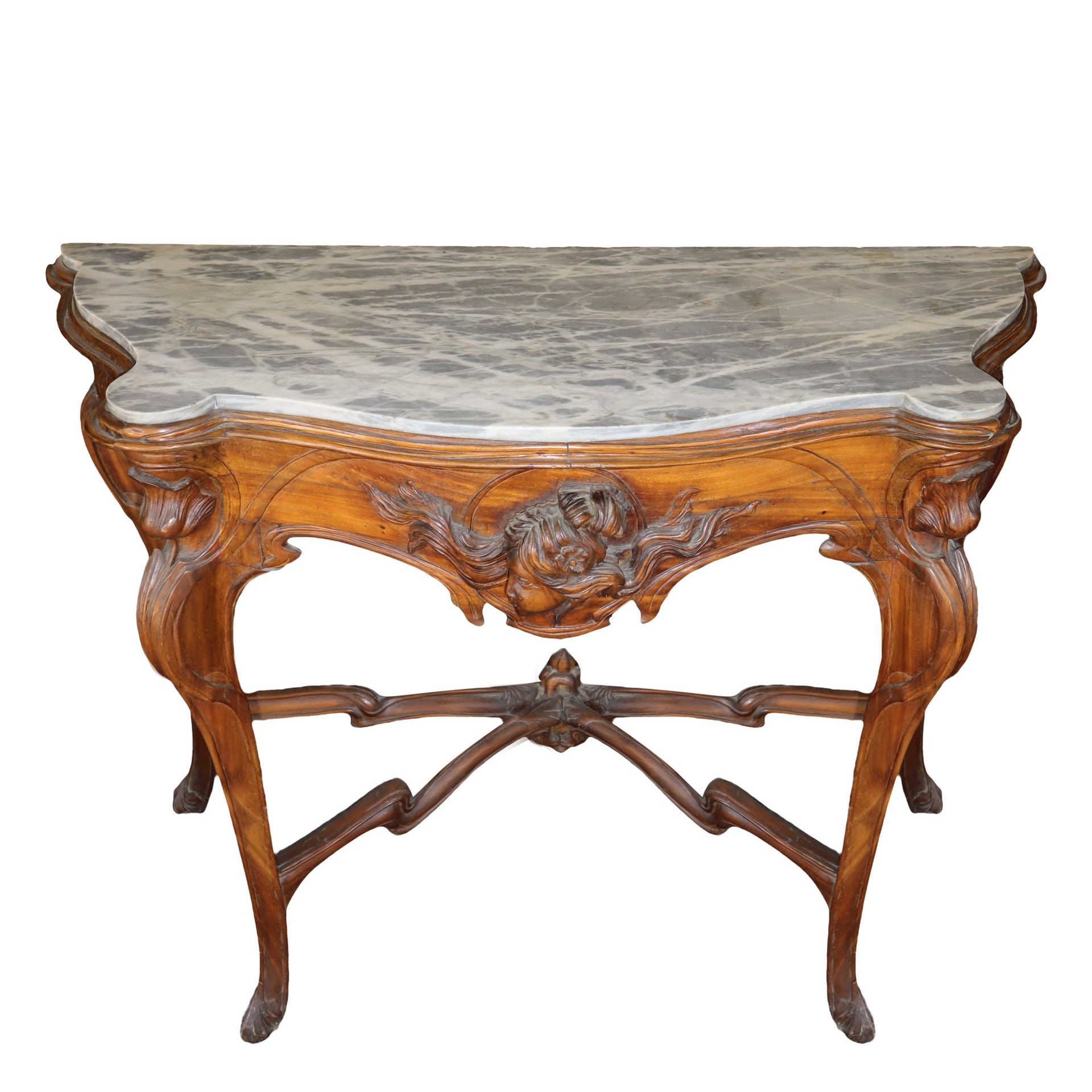 Console Liberty in legno di noce, marmo grigio bardiglio al piano, Primi 20° secolo H 104.5 x 135 x 56Fronte intagliato con viso di giovane donna a rilievo, legacci convergenti al centro.Fronte intagliato con viso di giovane donna a rilievo, legacci convergenti al centro.
