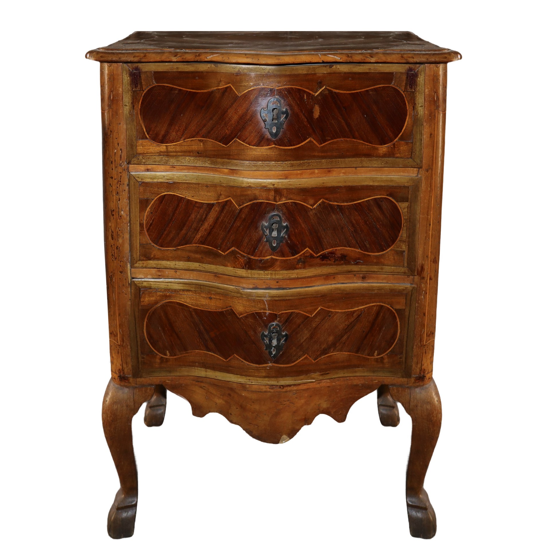 Comodino Luigi XV, Sicilia, 19° secolo h cm 75 x 56 x 35A 3 cassetti sul fronte inserti entro riserve di legno chiaro in legno di Palissandro, piedi a Cabriolet.A 3 cassetti sul fronte inserti entro riserve di legno chiaro in legno di Palissandro, piedi a Cabriolet.
