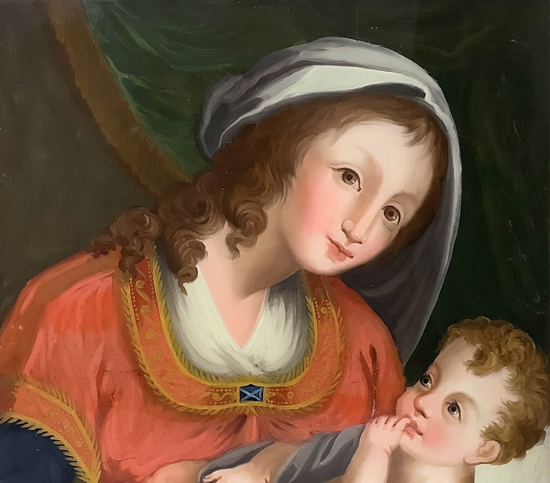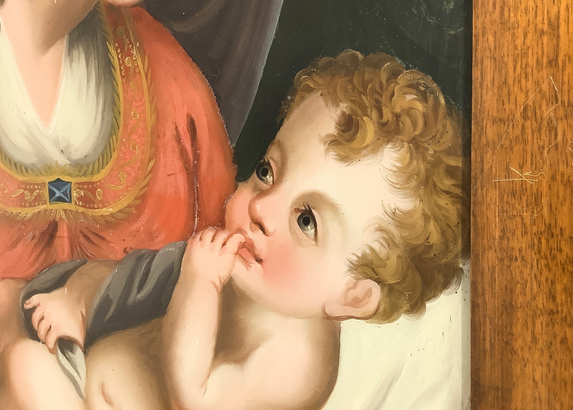 Madonna della mela con bambino, Sicilia, Tardo 18° secolo cm 58 x cm 42Vetro dipinto