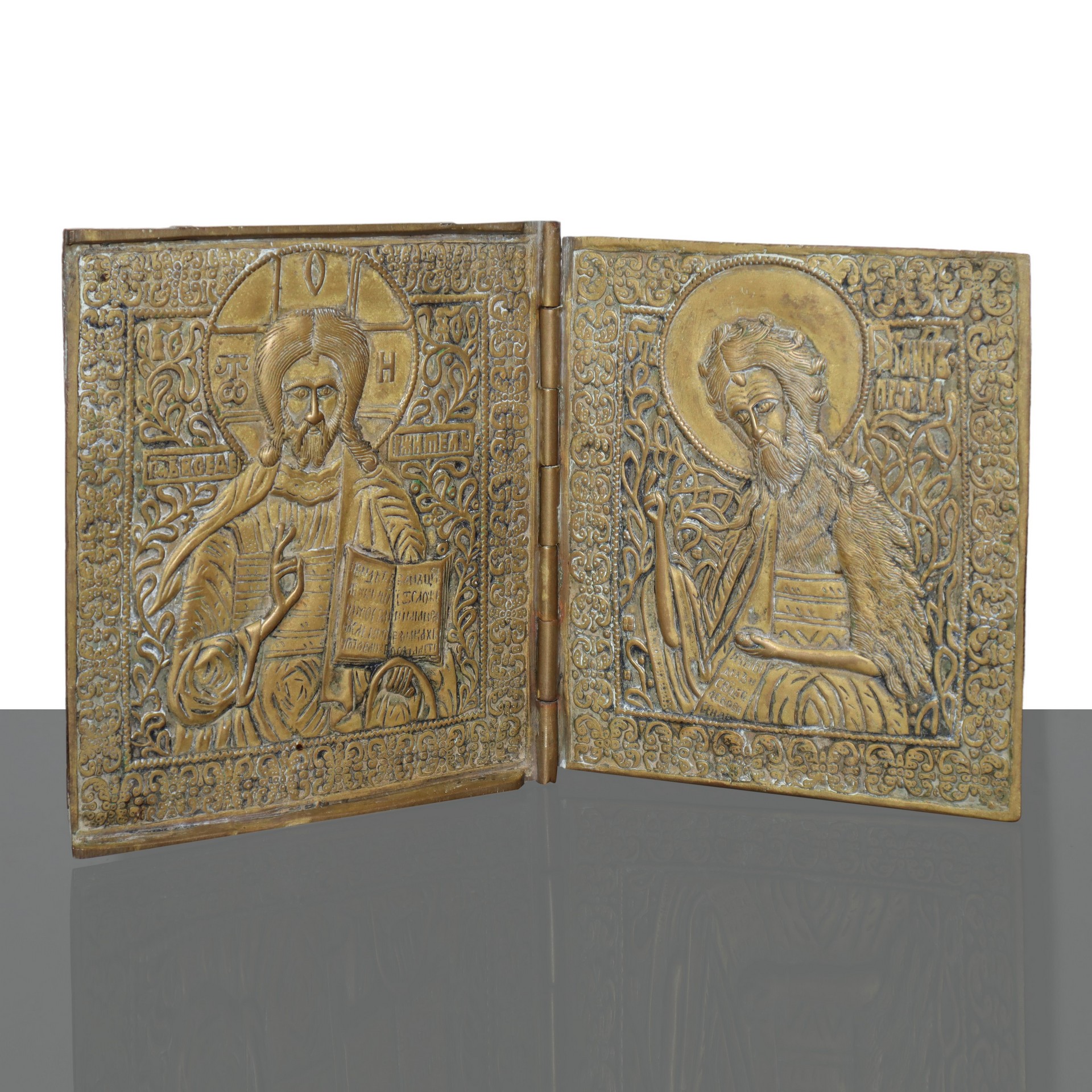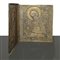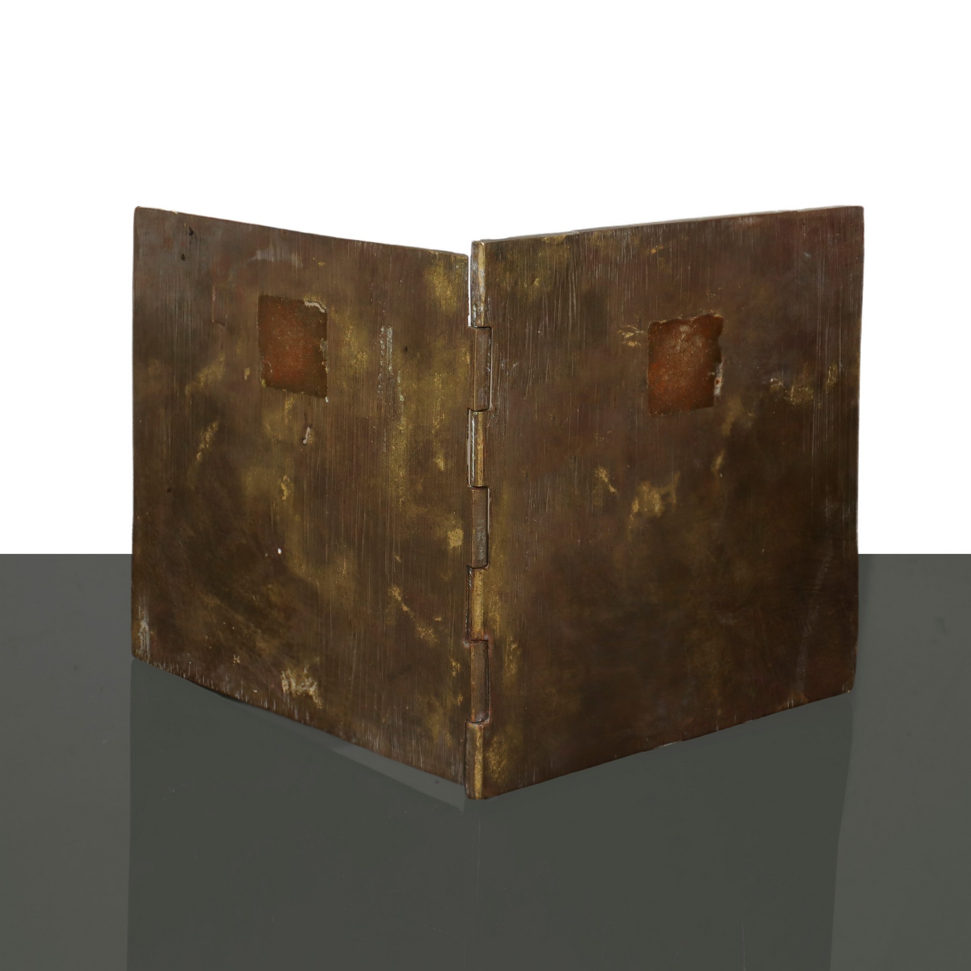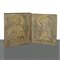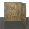 Icona russa da viaggio in bronzo, pieghevole. Immagini scolpite a rilievo Cm13,5X12,5, aperta cm 24 x13,5
