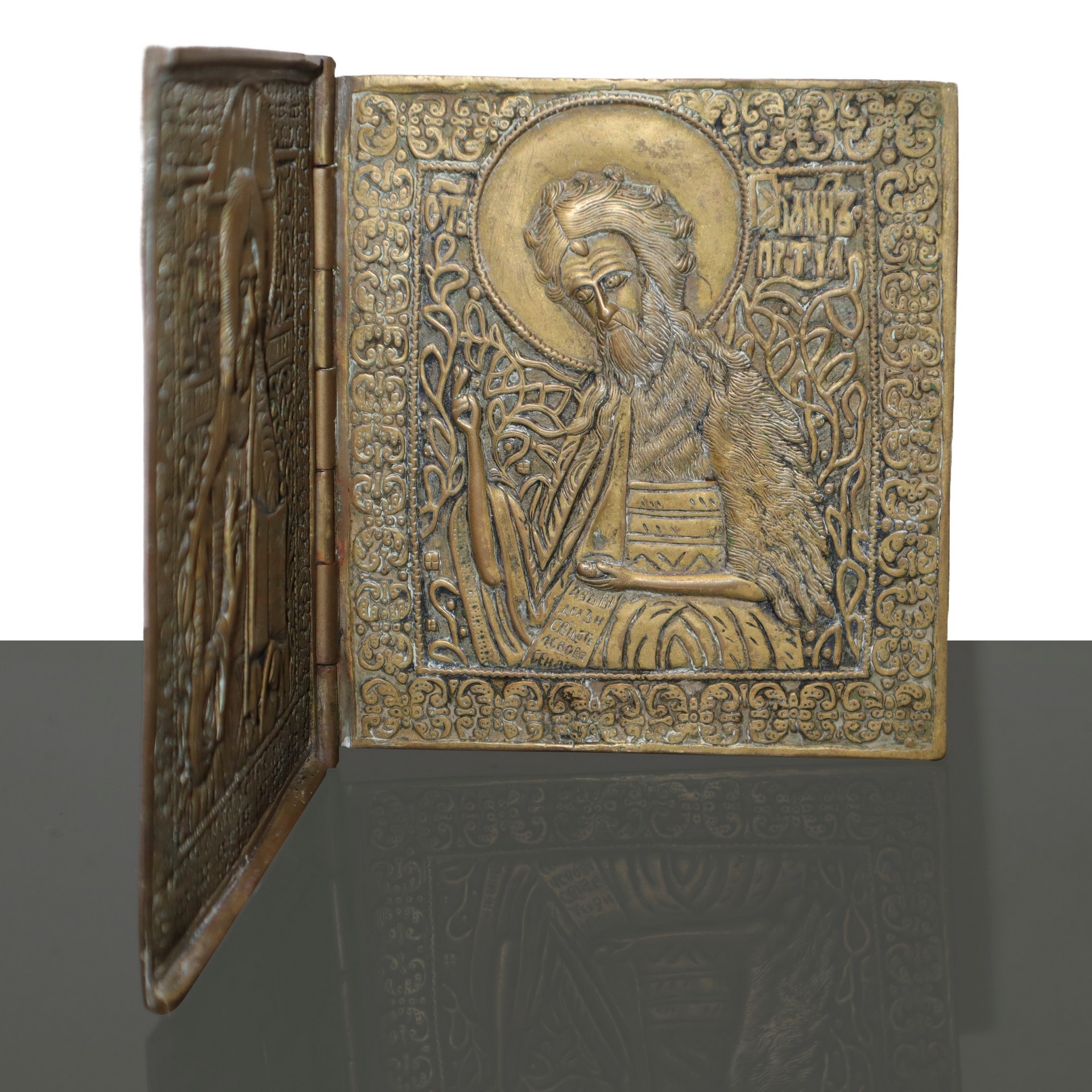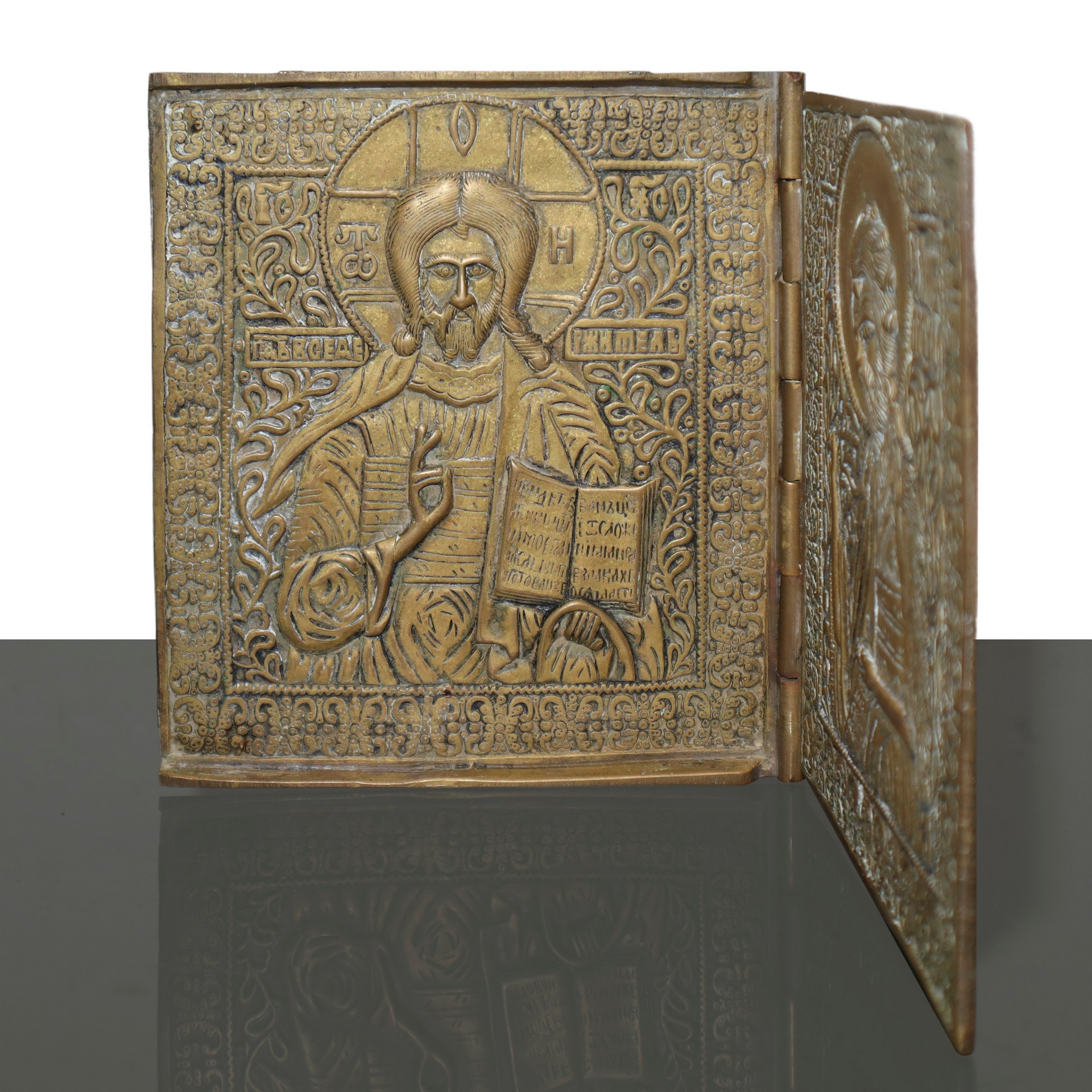 Icona russa da viaggio in bronzo, pieghevole. Immagini scolpite a rilievo