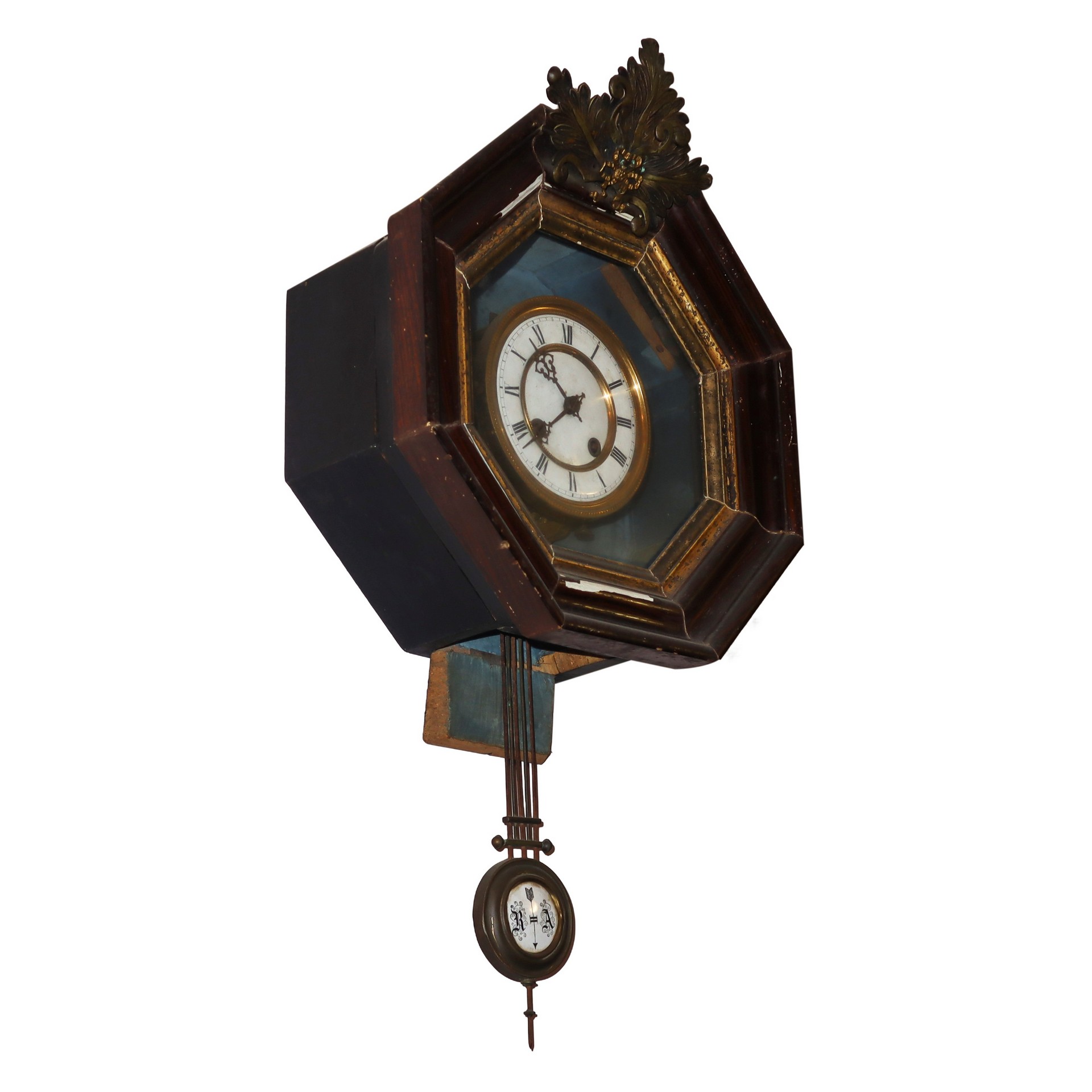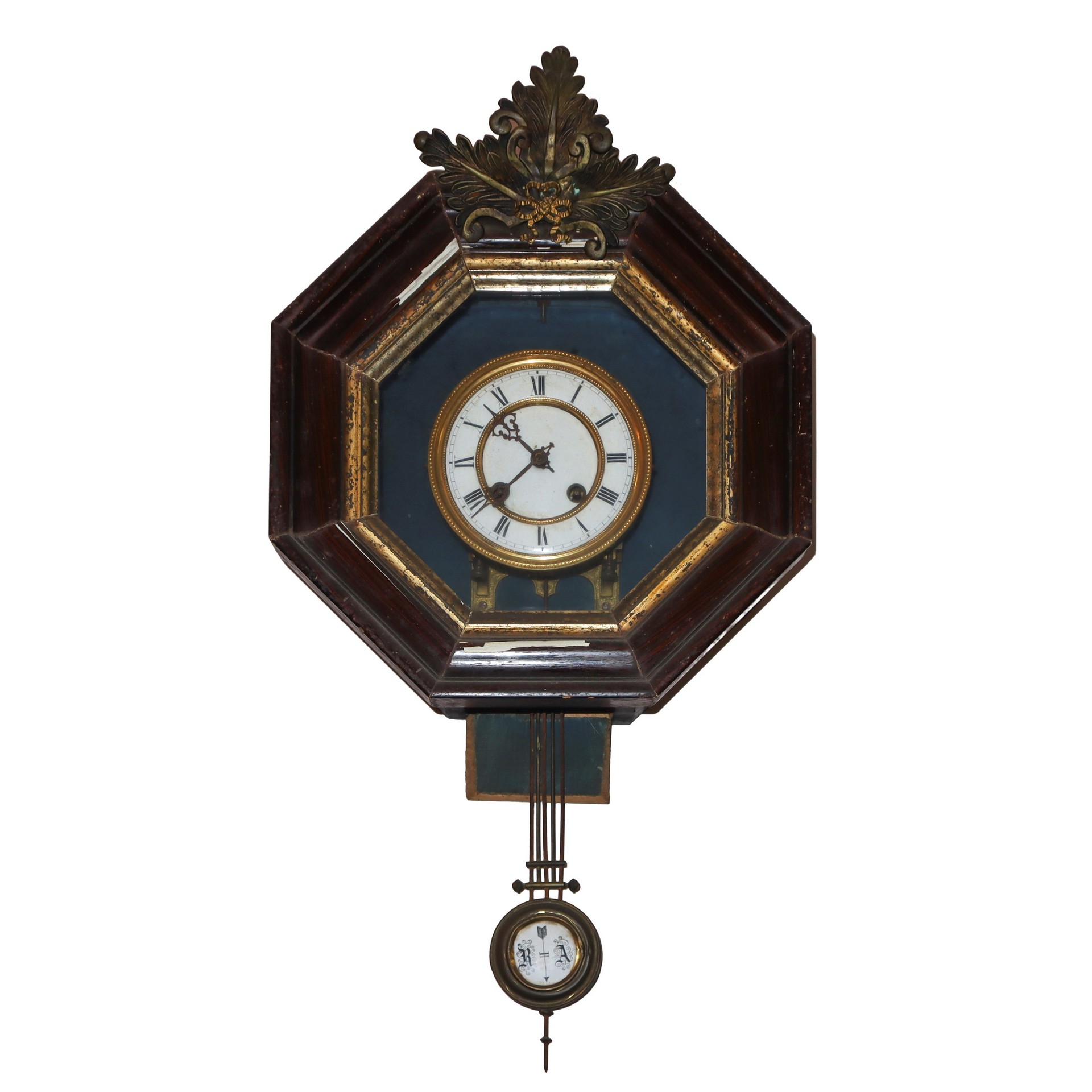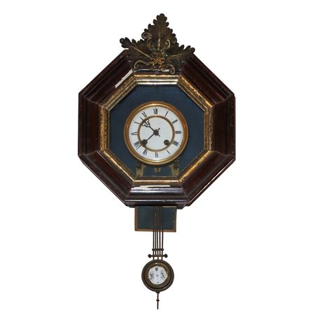 Orologio da muro a pendolo in metallo dorato, nineteen° secolo h cm 70x35In legno di mogano, forma ottagonale. Cornici in metallo dorato, cimasa sul lato superiore. Quadrante in porcellana con numeri romani e sul pendolo iniziali R. A. Da revisionareIn legno di mogano, forma ottagonale. Cornici in metallo dorato, cimasa sul lato superiore. Quadrante in porcellana con numeri romani e sul pendolo iniziali R. A. Da revisionare