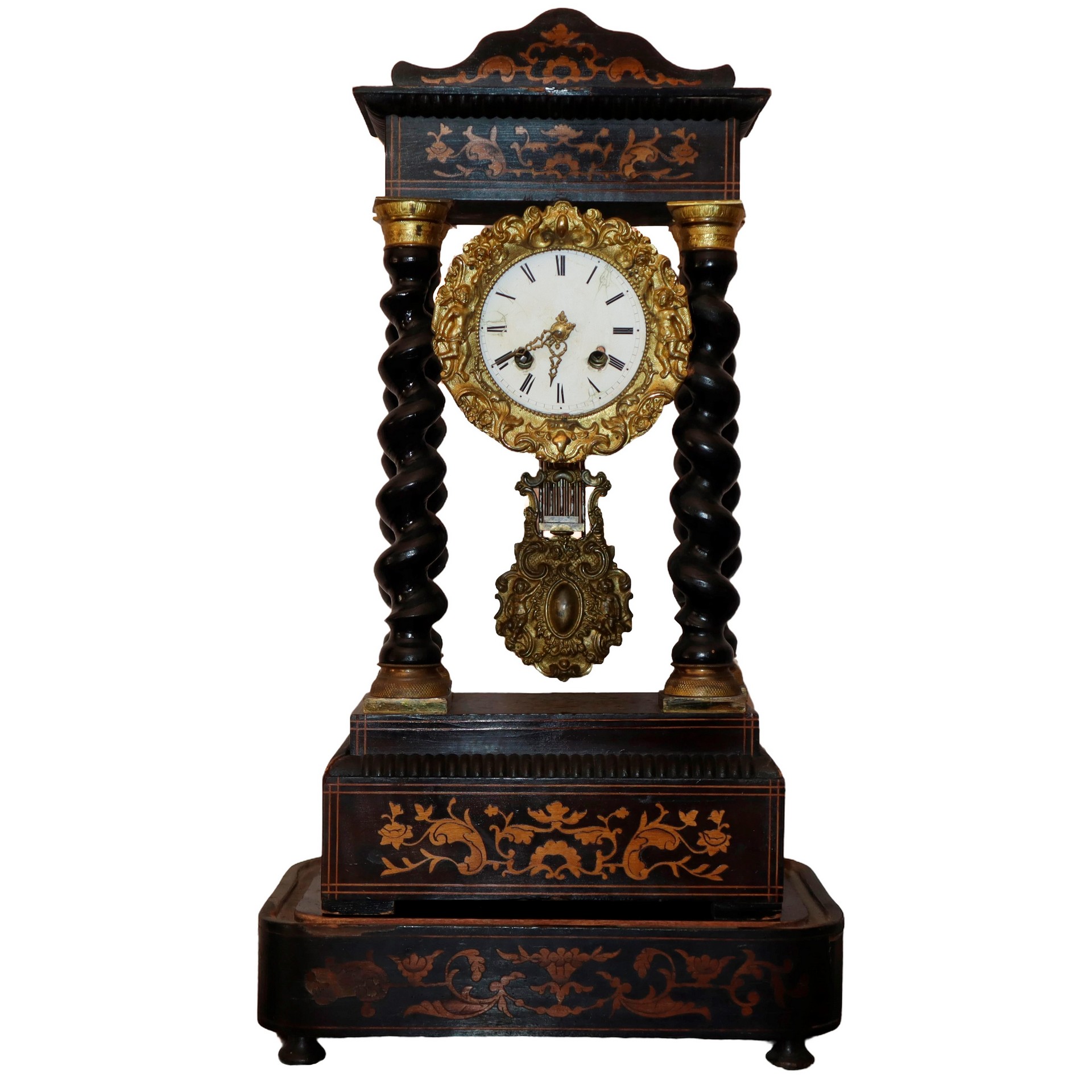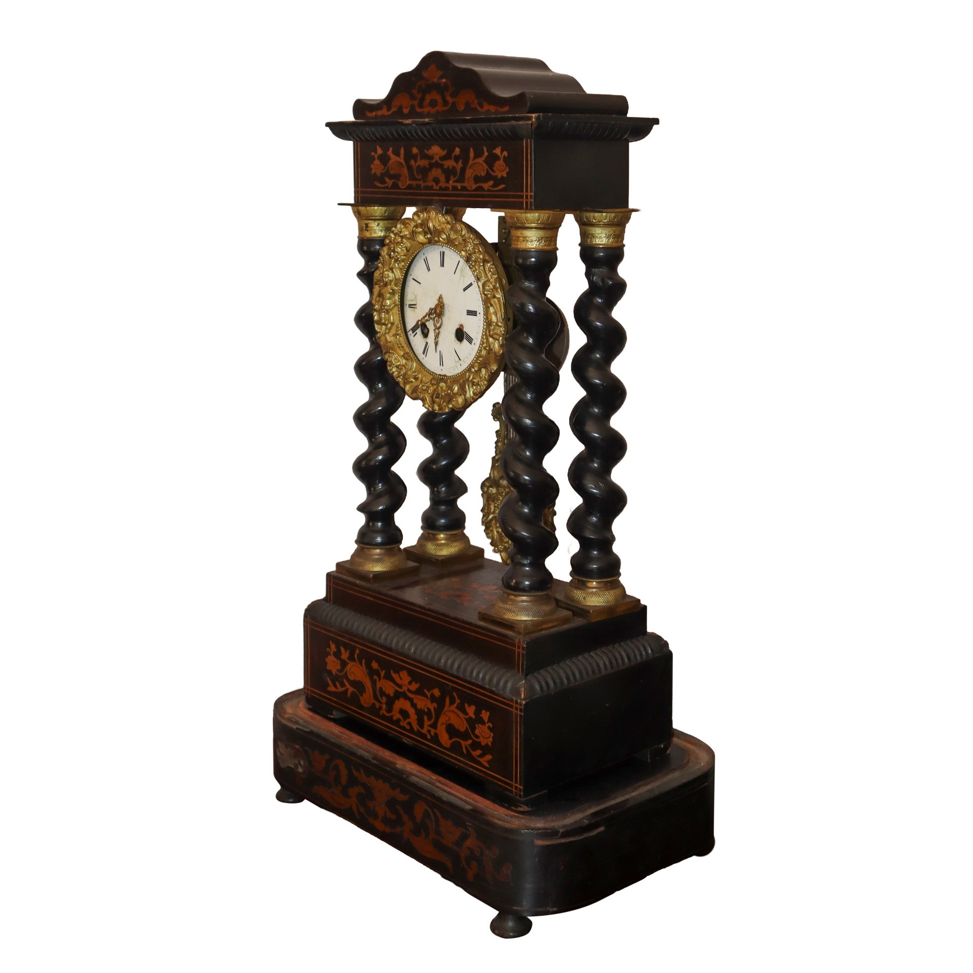 Orologio da tavolo a pendolo Carlo X, 19° secolo , c.1820cm 50,5x 28Con intarsi in legni chiari, colonne a torchon, quadrante in porcellana in cornice quadrata di ottone dorato. Da revisionare. In teca di vetroCon intarsi in legni chiari, colonne a torchon, quadrante in porcellana in cornice quadrata di ottone dorato. Da revisionare. In teca di vetro