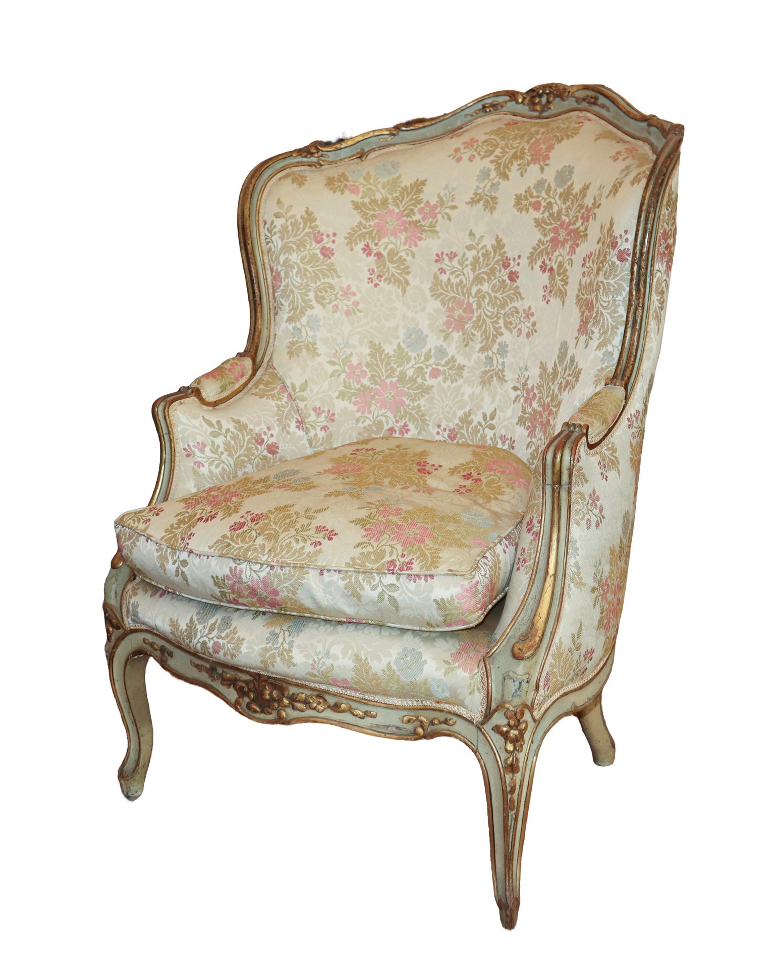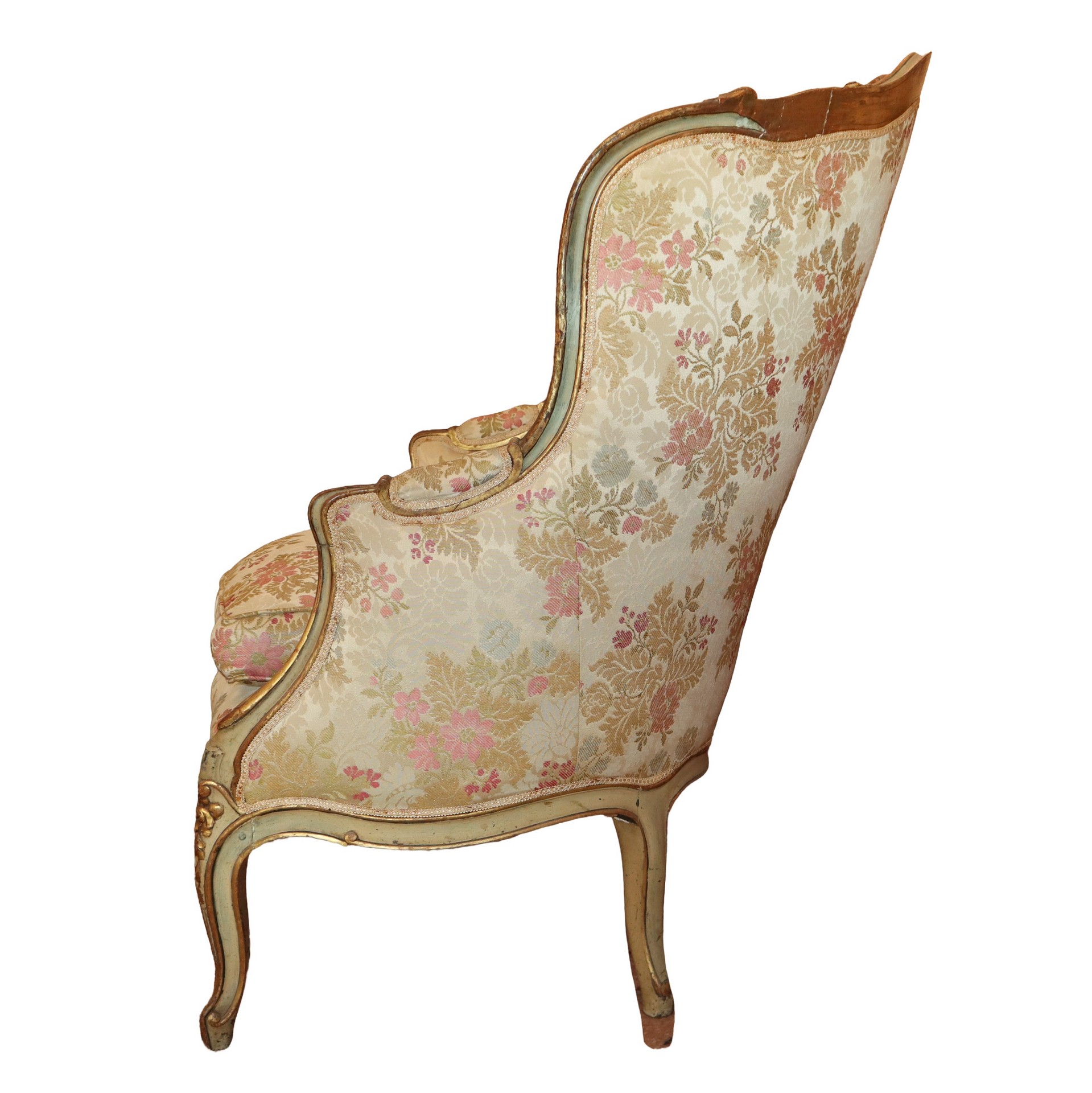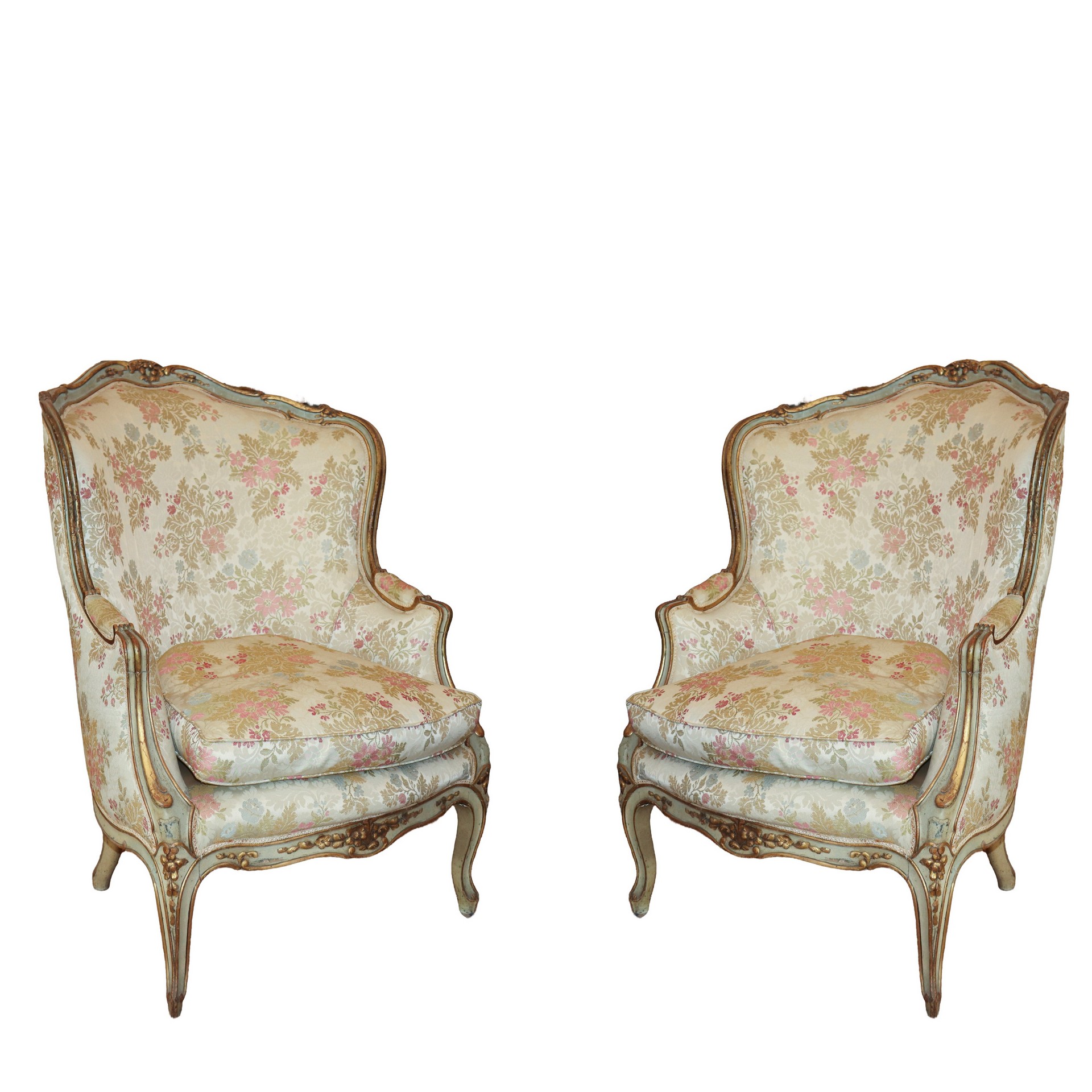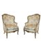 Antica coppia di bergeres, Luigi XV. In legno finemente intagliato e laccato. Tapezzeria a motivi floreali.