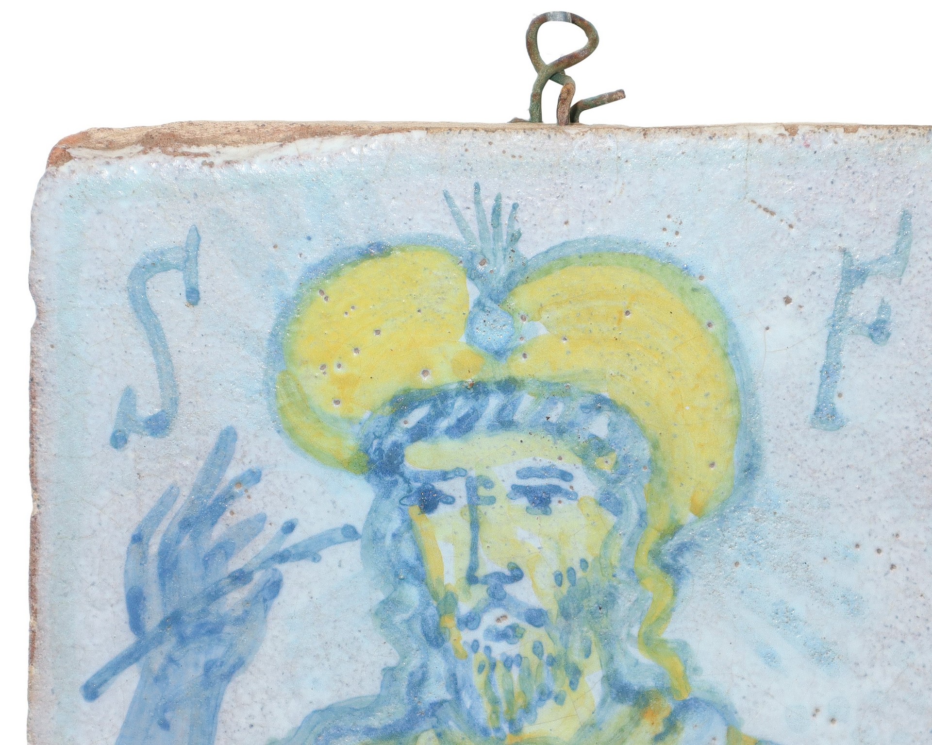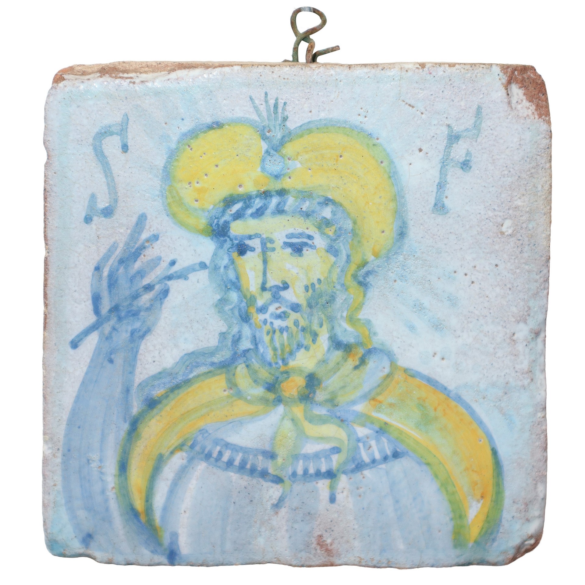 Mattonella Caltagirone raffigurante Santo, 18° secolo cm 14,5x14,5