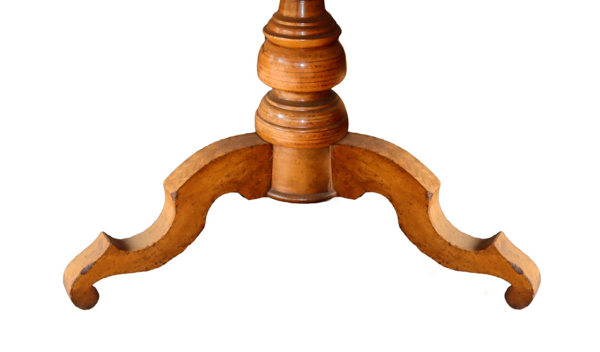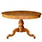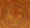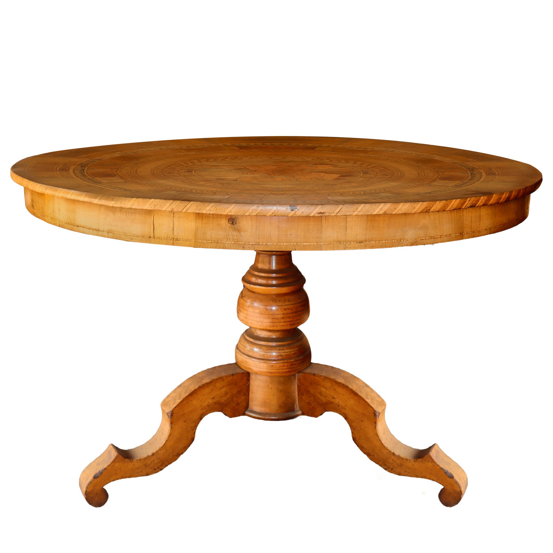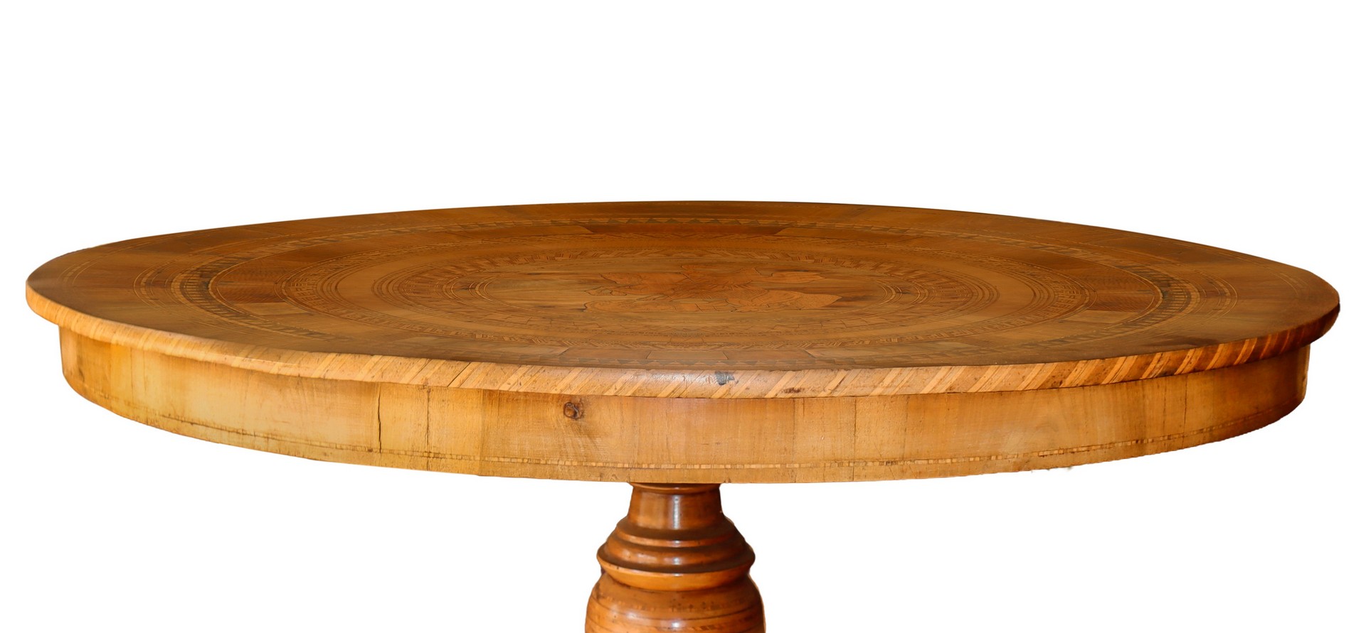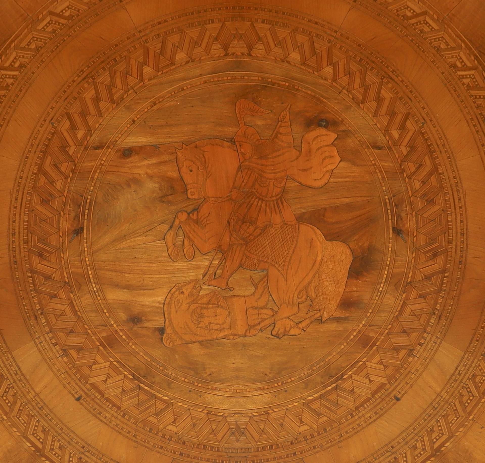 Antico tavolo rotondo Sorrentino, in legno di noce, intarsiato in legni vari a contrasto, a motivi circolari concentrici. Figura centrale raffigurante San Giorgio e il Drago.