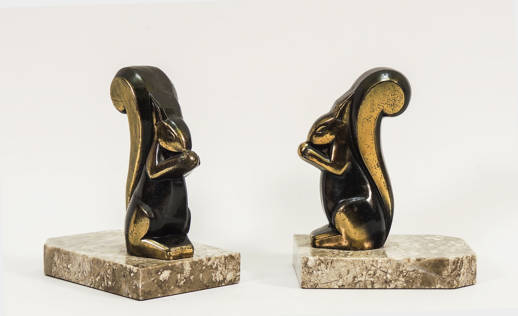 COPPIA DI FERMALIBRI IN METALLO PATINATO - PAIR OF PATINATED METAL BOOKENDS realizzati come due scoiattoli, su basi in travertino h cm 14