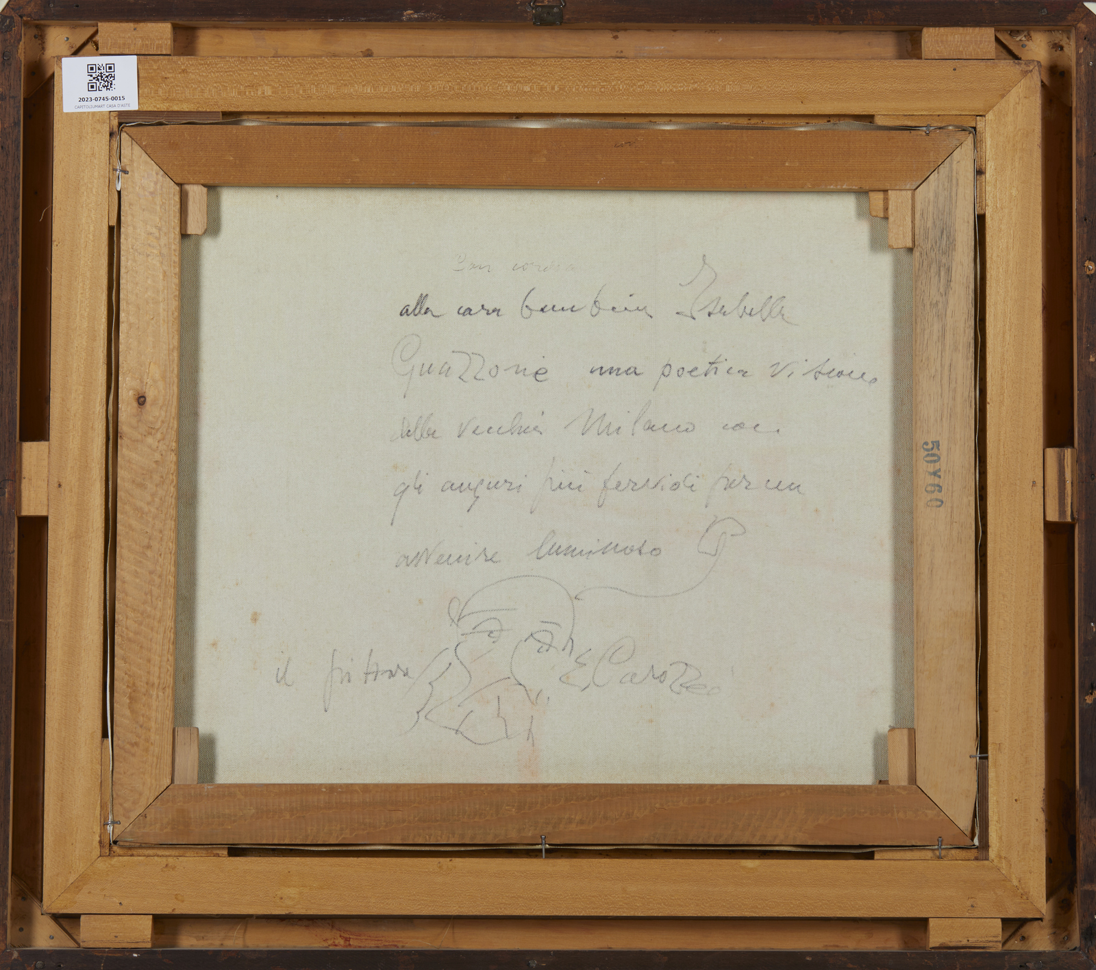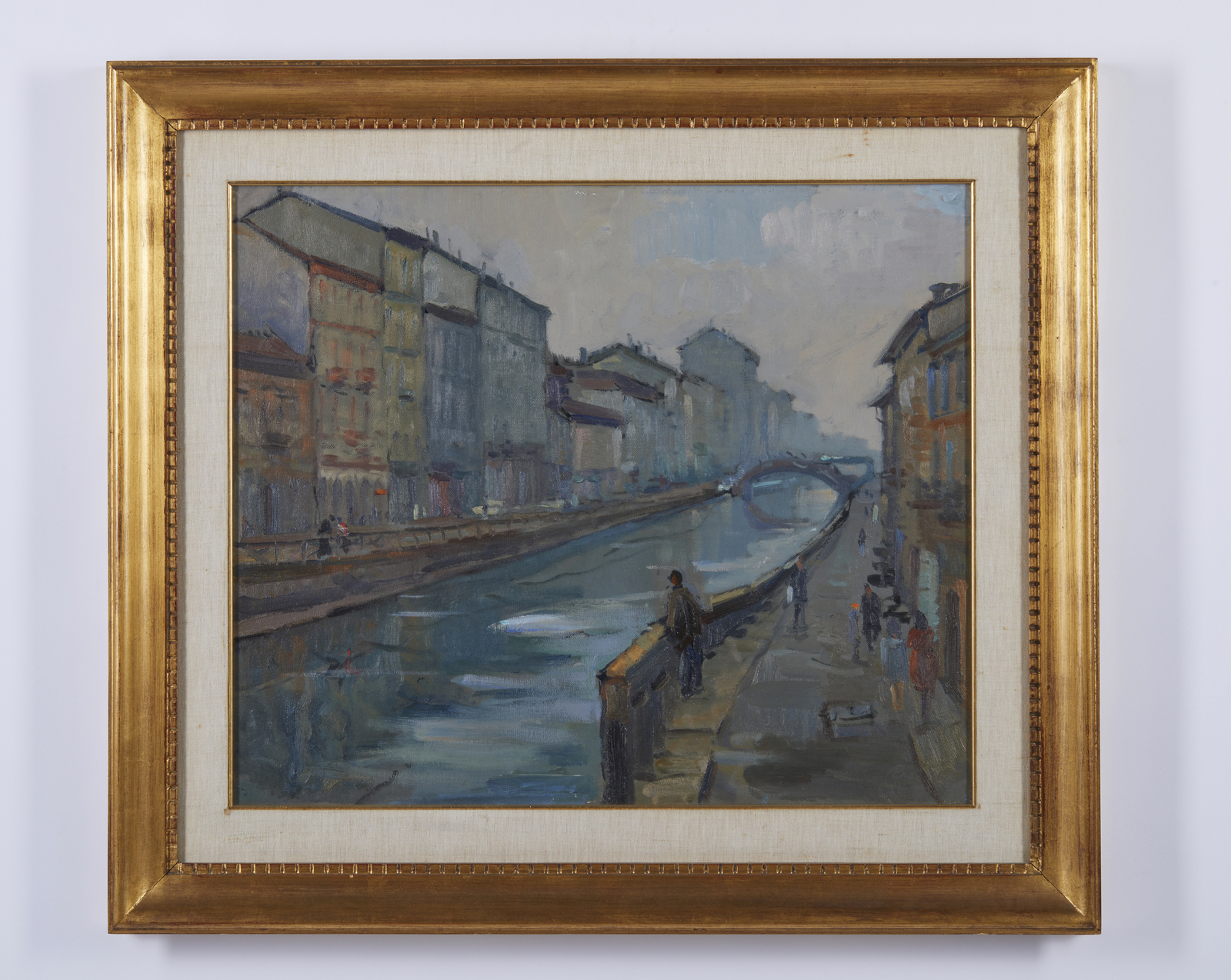 CAROZZI ENRICO (1910 - 1985) Naviglio. Olio su tela . Cm 60,00 x 50,00. Al retro firma e dedica. Lievi difetti. Cornice presente