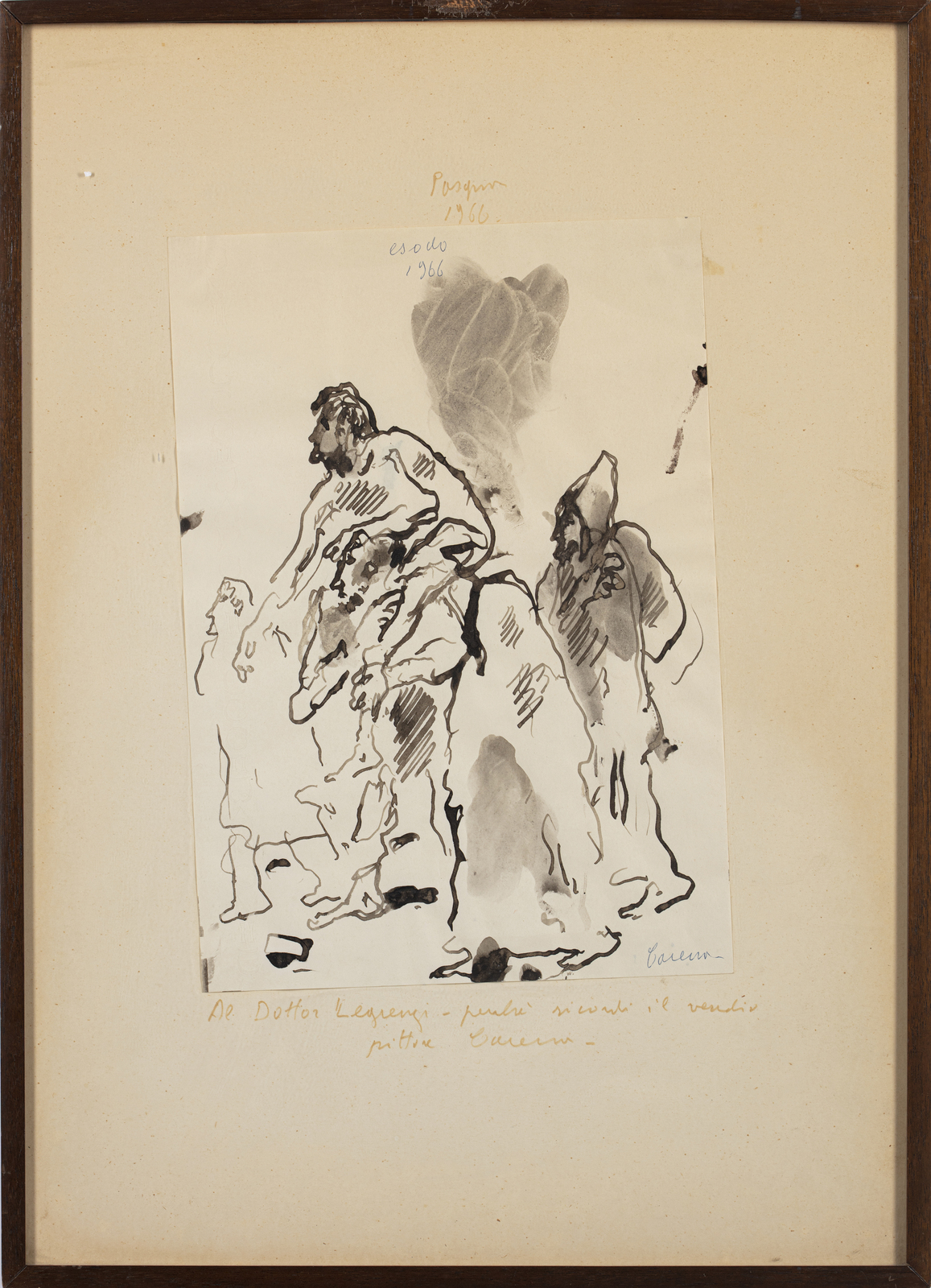 CARENA FELICE (1879 - 1966) Esodo. 1966. Inchiostro bruno e acquerello su carta. Cm 21,00 x 30,00. Firma in basso a destra. Titolo e anno in alto al centro. Dedica in basso. Cornice presente
