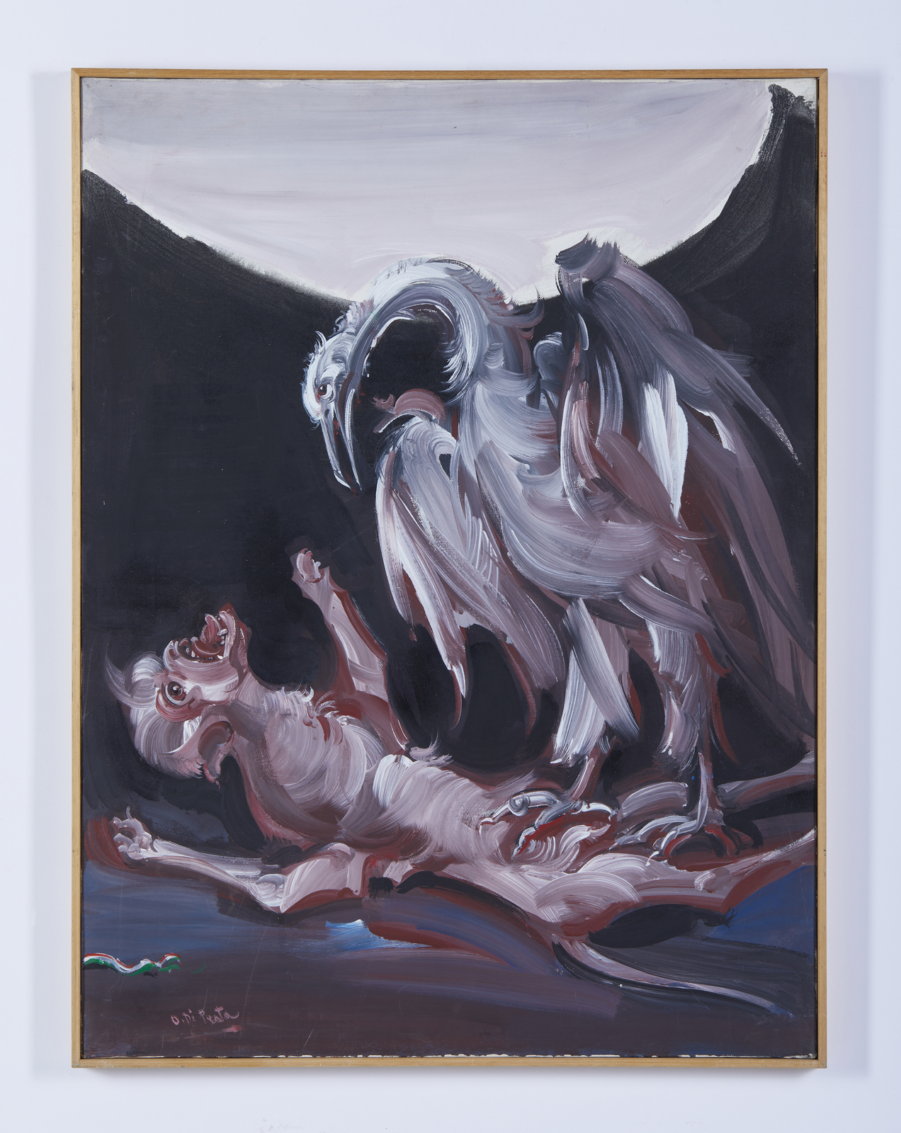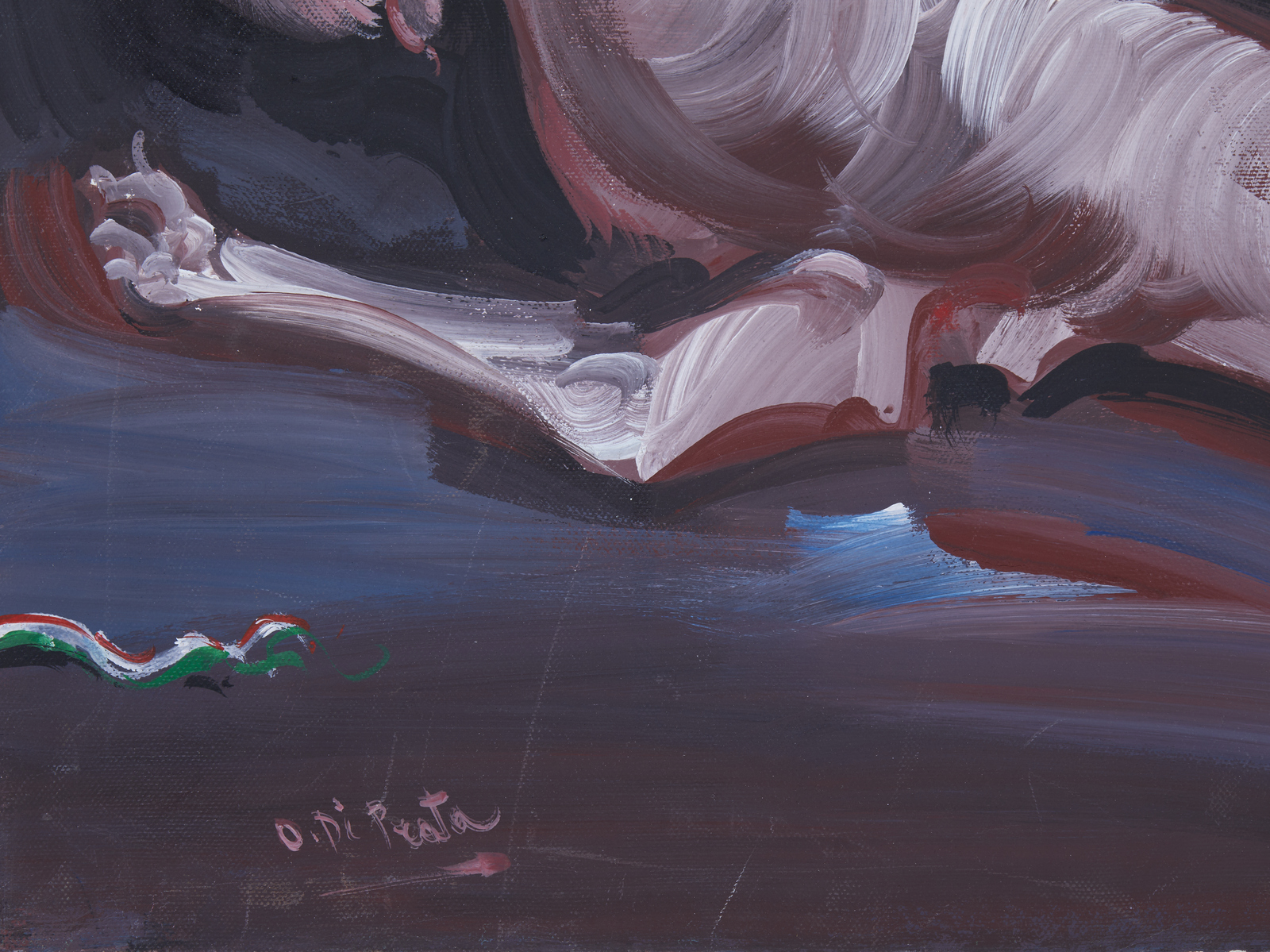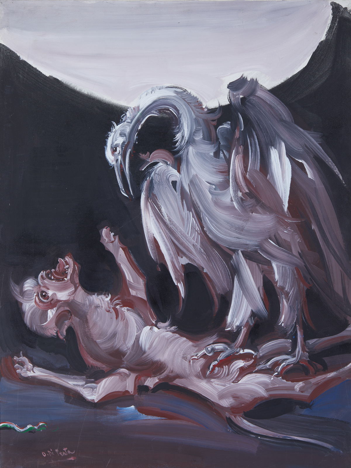DI PRATA OSCAR (1910 - 2006) Senza titolo. Tecnica mista su tela. Cm 60,00 x 80,00. Firma in basso a sinistra. Pubblicazioni: La pittura di Oscar Di Prata, a cura di Lino Lumini, Stampatore in Travagliato, 1993, p. 347 (pubblicata a pagina piena con il titolo "Rapace 1979". Lievi difetti. Cornice presente