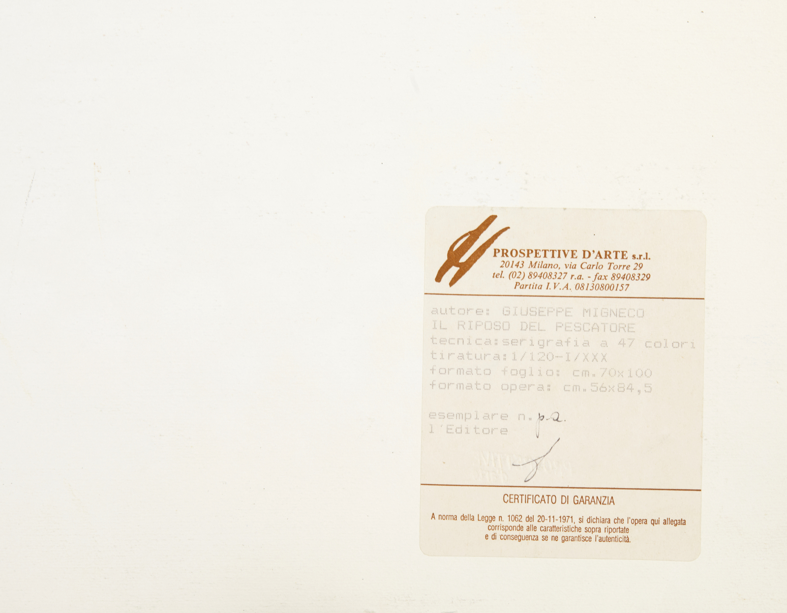 MIGNECO GIUSEPPE (1908 - 1997) Il riposo del pescatore. Serigrafia materica. Cm 99,00 x 69,00. P.a. Tiratura e firma in basso a matita. Timbro a secco Prospettive d'arte in basso a sinistra. Al retro cartiglio descrittivo Prospettive d'Arte, Milano. Edizione totale: +XXX esemplari. Lievi difetti.