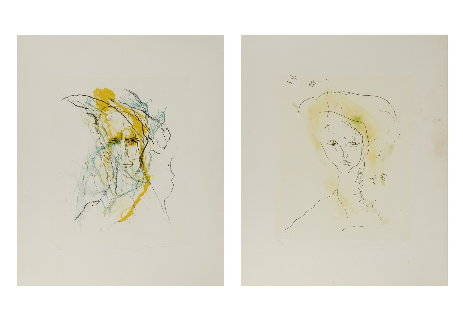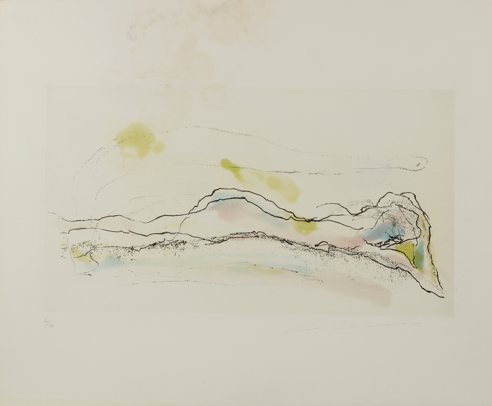 2) 32/90. Tiratura e firma in basso a matita. 50x60 cm. Dimensione lastra: 28x49.5 cm. Difetti.