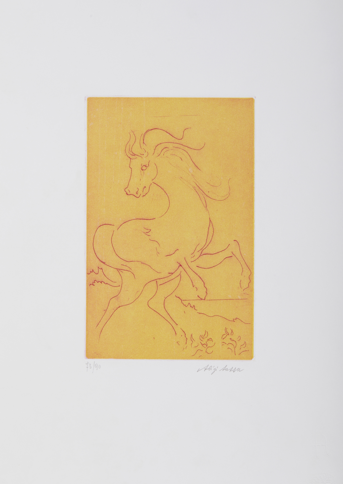 SASSU ALIGI (1912 - 2000) Cavallo Xanto alba. Acquaforte e acquatinta. Cm 35,00 x 50,00. 73/90. Tiratura e firma in basso a matita. Dimensioni lastra: 26x16,5 cm. Timbro a secco della galleria Turelli in basso a destra.
