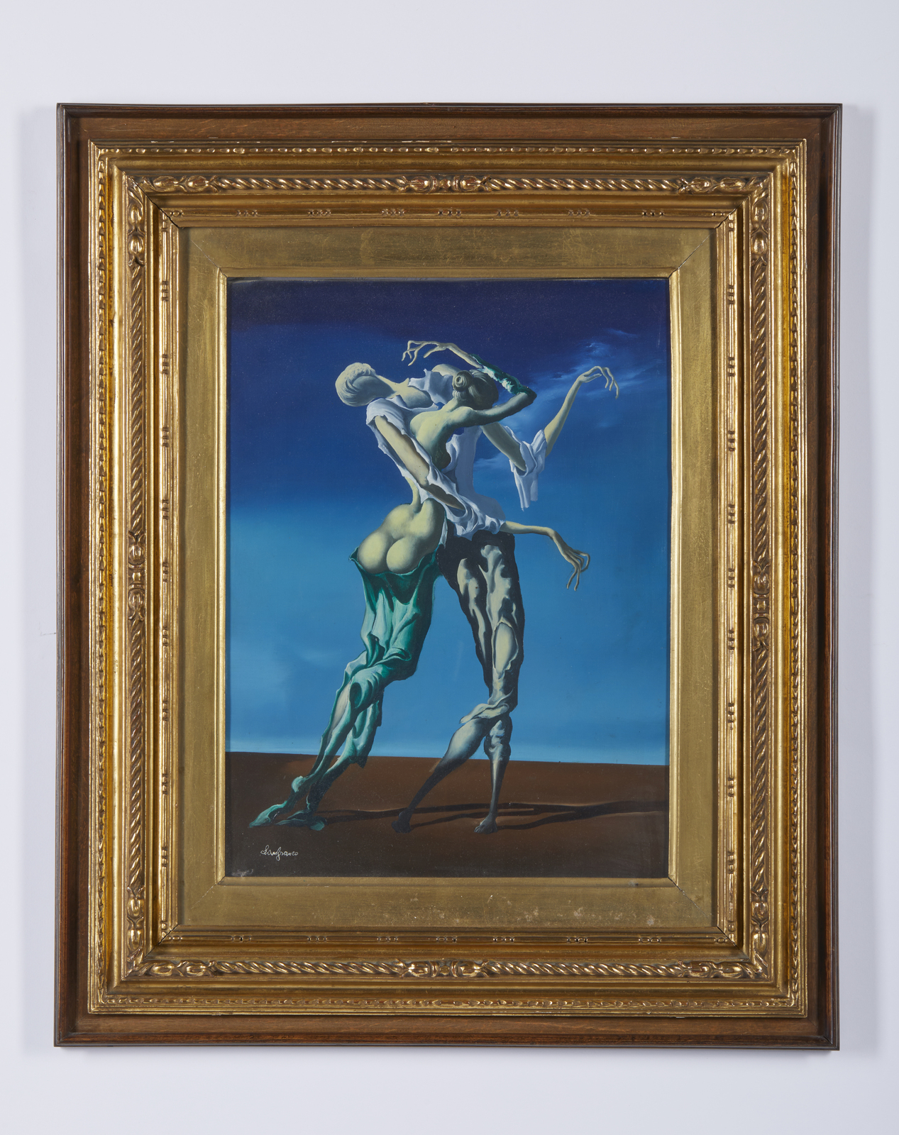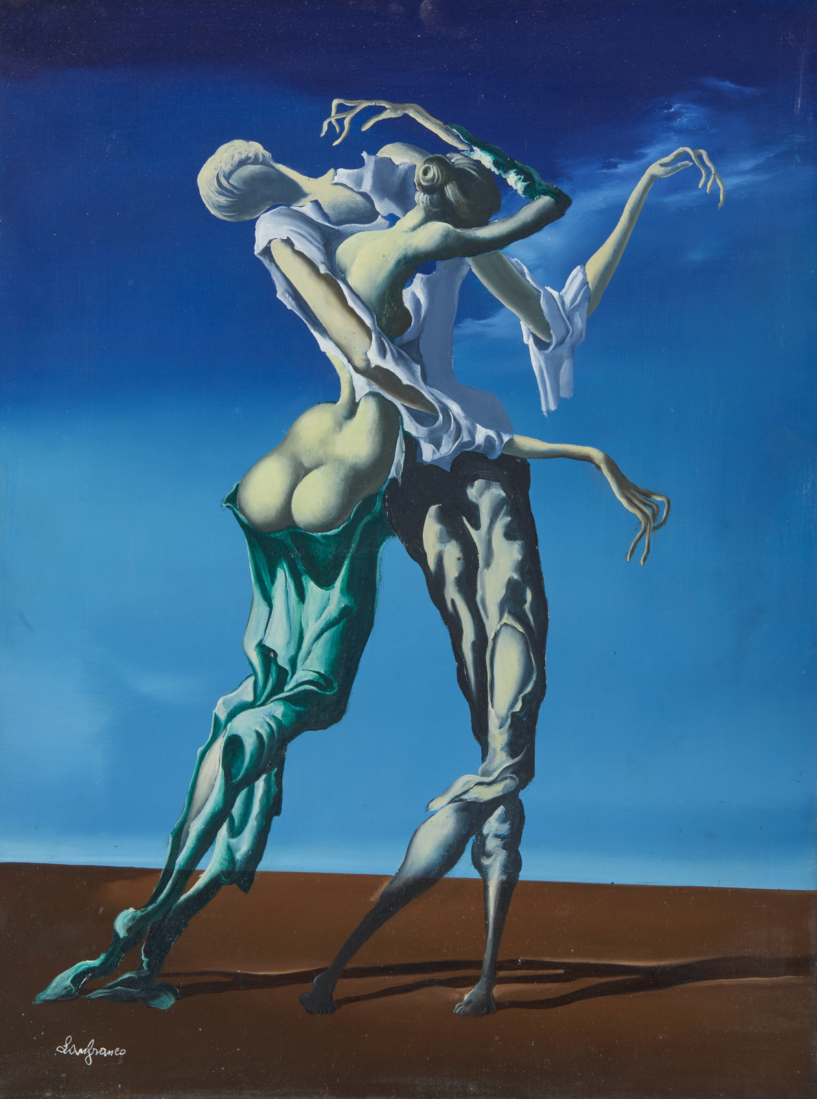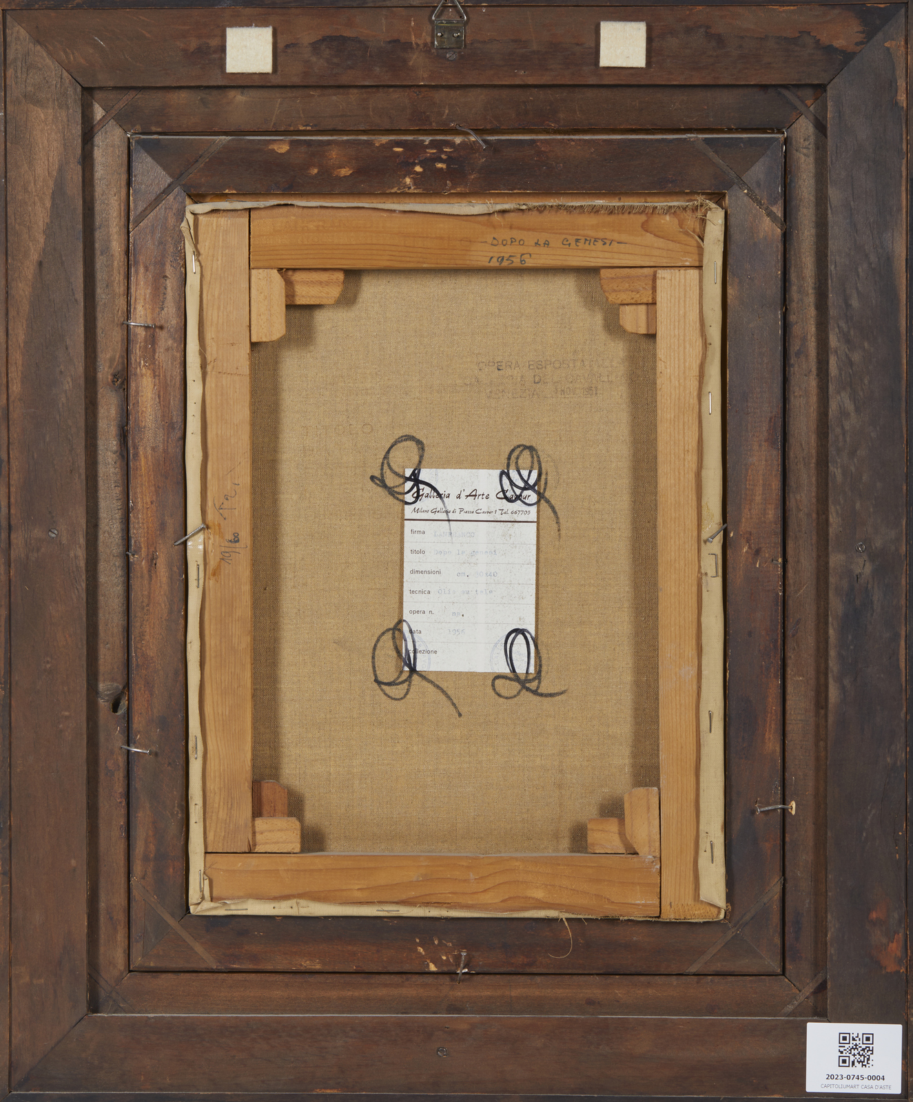 FRIGERI LANFRANCO (n. 1920) Dopo la Genesi. 1956. Olio su tela . Cm 30,00 x 40,00. Firma in basso a sinistra. Al retro titolo, anno, cartiglio descrittivo Galleria d'Arte Cavour, Milano e timbro Galleria del Cavallino, Venezia. Cornice presente