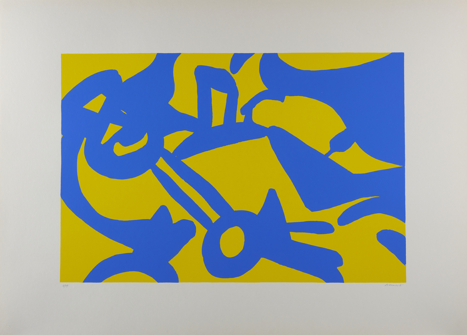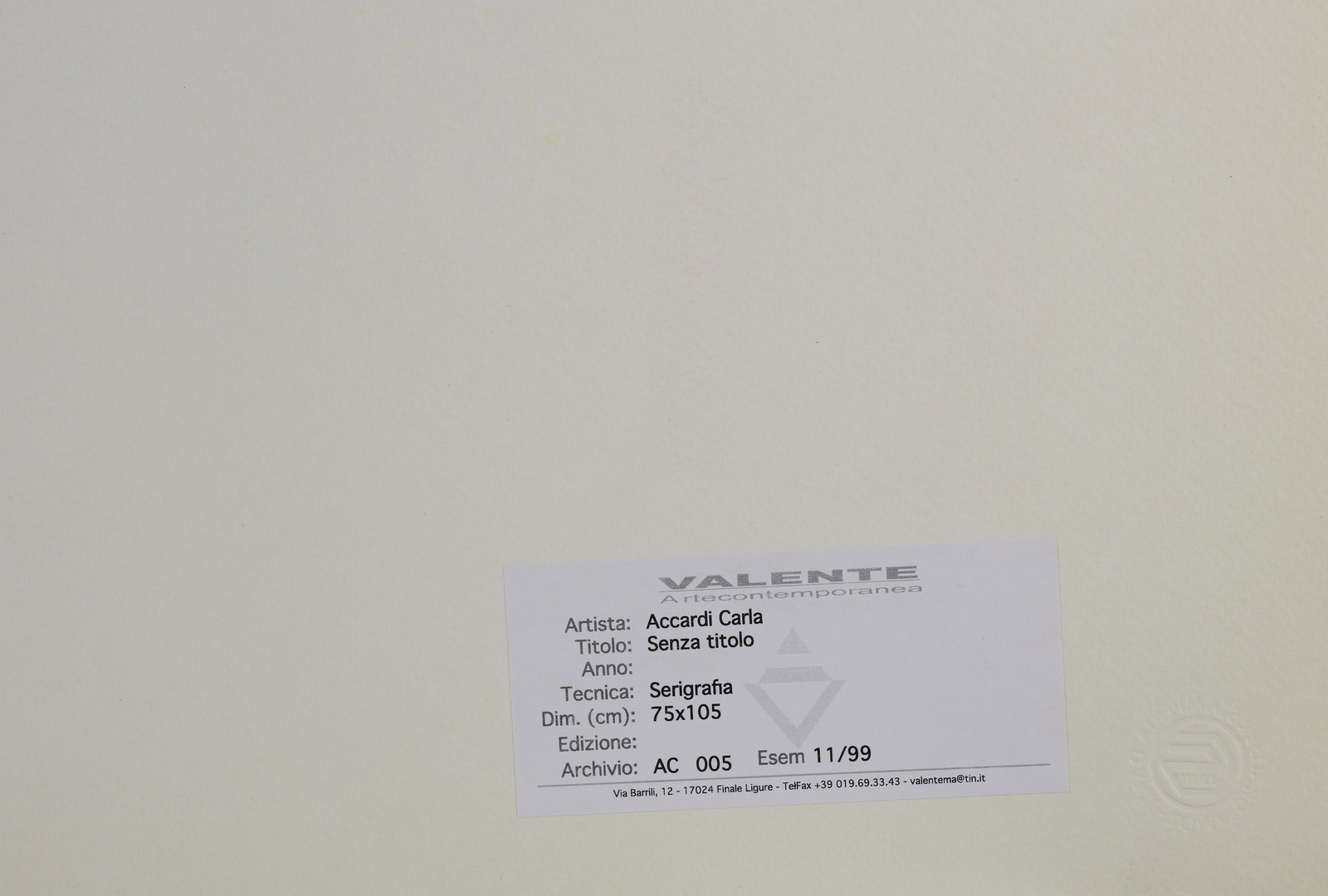 ACCARDI CARLA (1924 - 2014) Senza titolo. Serigrafia. Cm 105,00 x 75,00. 11/99. Tiratura e firma in basso a matita. Dimensioni lastra: cm 51x76. Timbro a secco - Stamperie Carafiser, Roma - in basso a sinistra.
