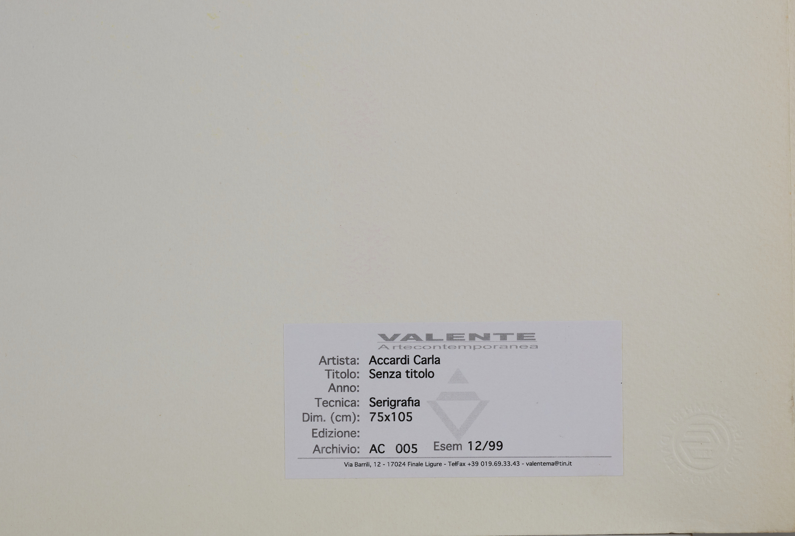 ACCARDI CARLA (1924 - 2014) Senza titolo. Serigrafia. Cm 105,00 x 75,00. 12/99. Firma e tiratura in basso a matita. Dimensioni lastra: cm 51x76. Timbro a secco - Stamperie Carafiser, Roma - in basso a sinistra.