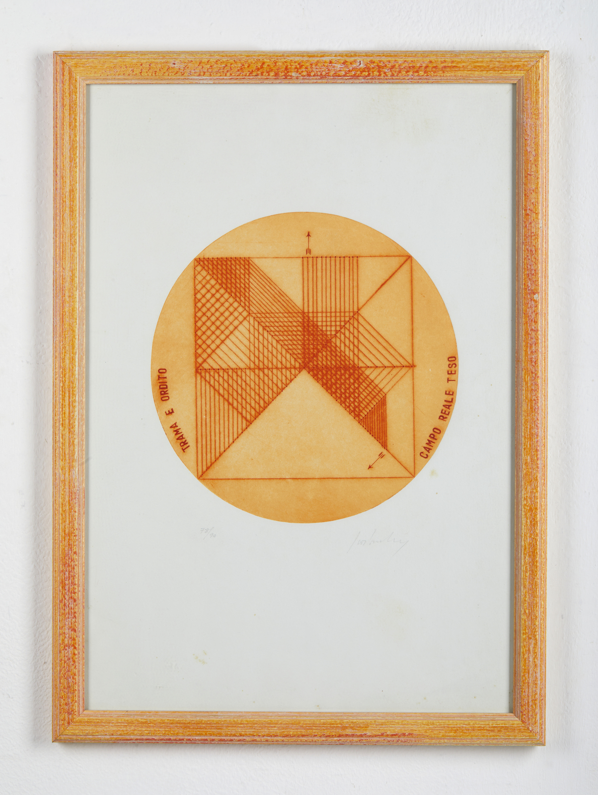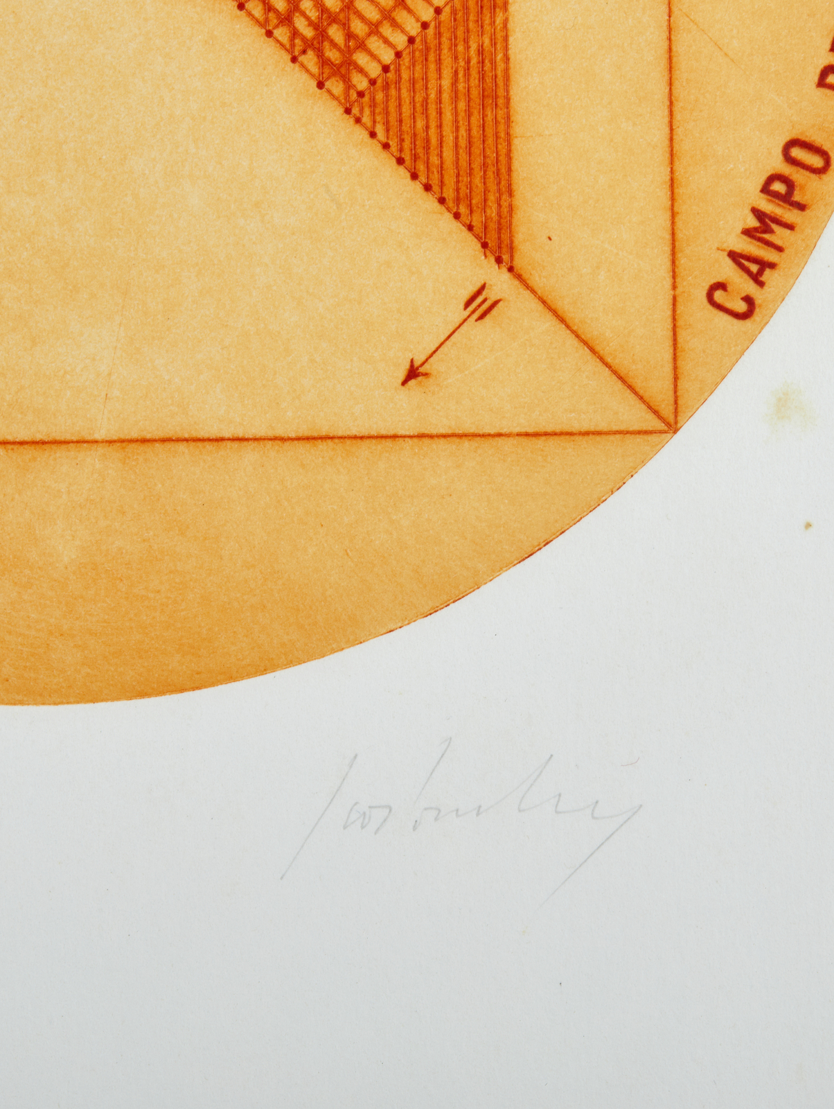 POMODORO GIO' (1930 - 2002) Campo reale teso. Acquaforte e acquatinta. Cm 35,00 x 50,00. 78/90. Tiratura e firma in basso a matita, Edizione totale: 90 esemplari. Diametro lastra: 23.6 cm. Carta a mano Magnani. Certificato di provenienza rilasciato da Albatros di F. Giusti, Milano. Lievi difetti. Cornice presente