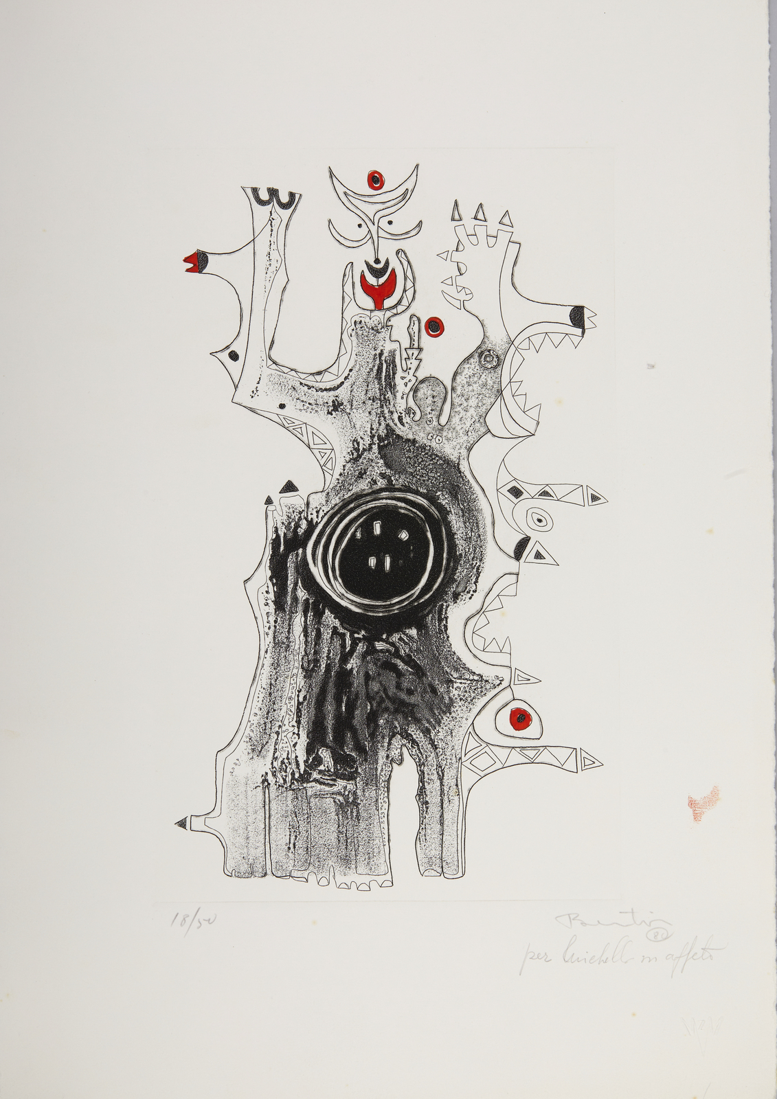 LOPES BERTINA (1924 - 2012) Senza titolo. 1980. Acquaforte. Cm 34,50 x 50,00. 18/50. Tiratura, firma, dedica e anno in basso a matita. Timbro a secco MZM in basso a destra. Dimensione lastra: 33.5x21 cm. Lievi difetti,