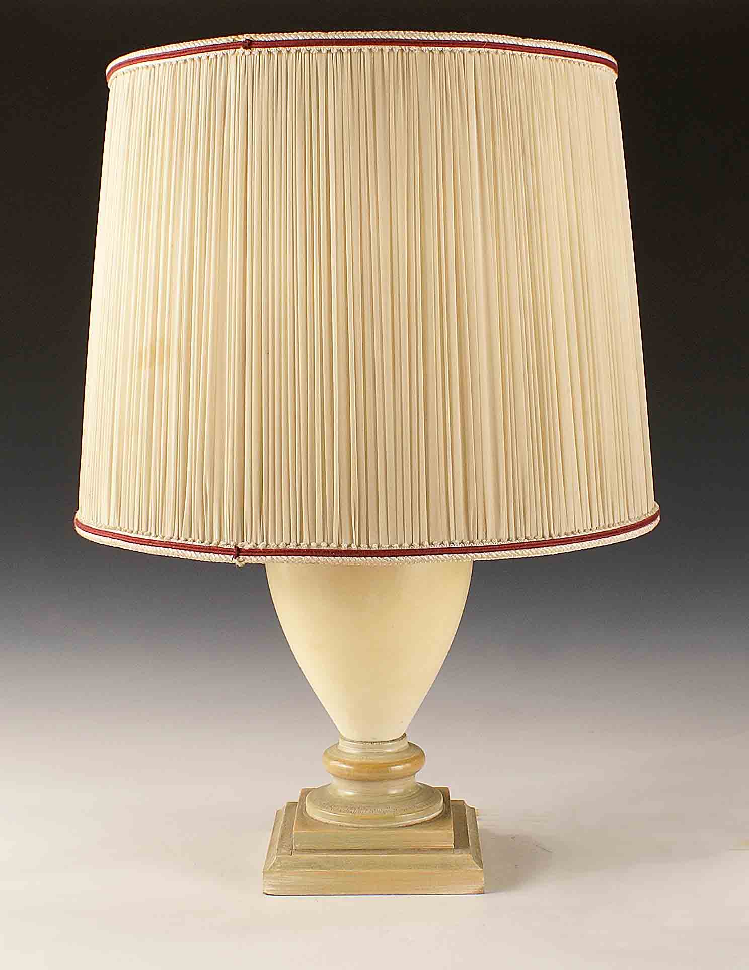 Lampada in legno laccato nella tonalità del verde, completa di paralume in tessuto, h. cm. 57.
