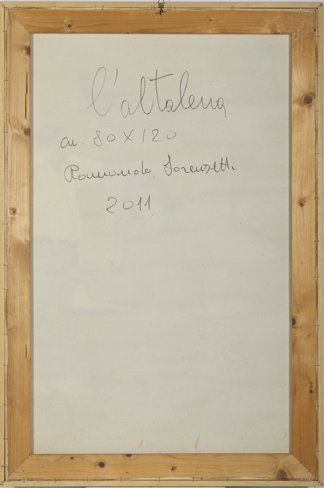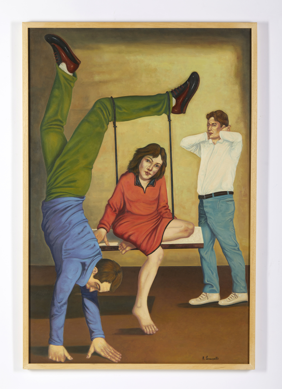 LORENZETTI RAIMONDO (n. 1948) L'altalena. 2011. Olio su tela . Cm 77,80 x 117,50. Firma in basso a destra. Al retro titolo, firma e anno. Cornice presente