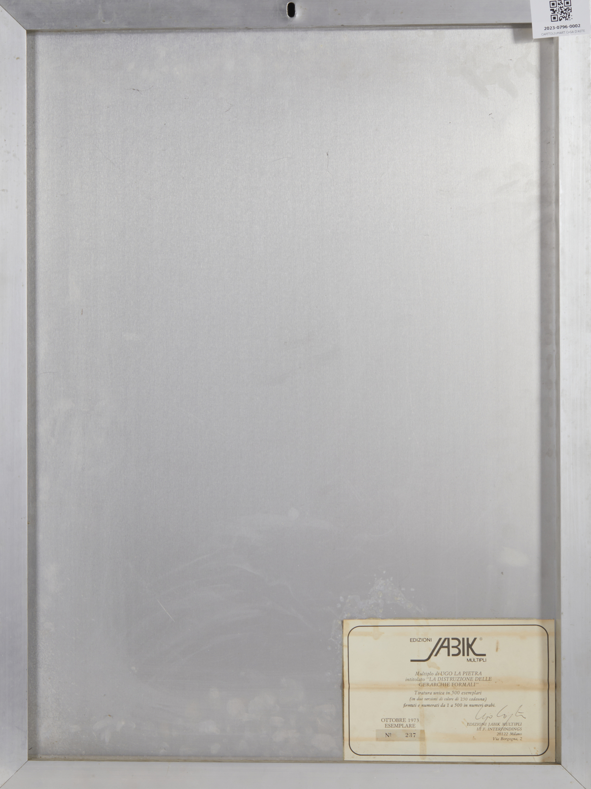 LA PIETRA UGO (n. 1938) La distruzione delle gerarchie formali. Serigrafia su metallo. Cm 55,00 x 75,00. 237/500. Al retro cartiglio con tiratura e firma. Edizione totale: 500 esemplari. Edizioni Jabik Multipli, Milano. Difetti.