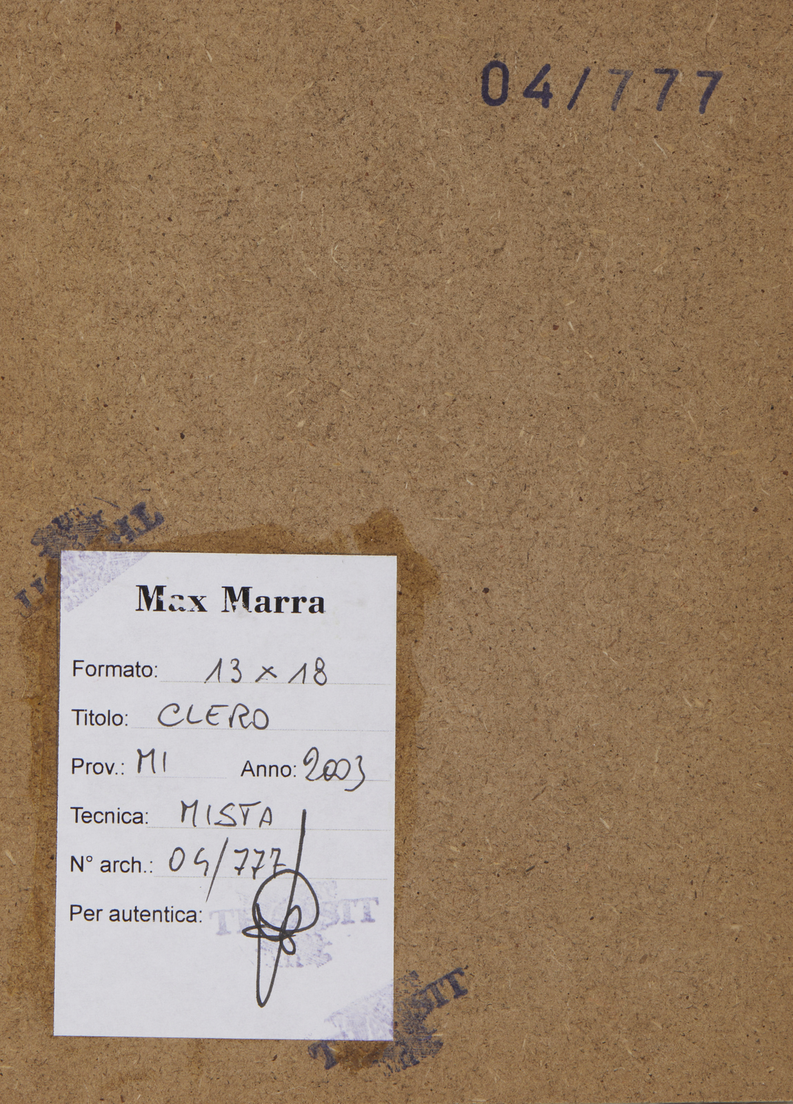 MARRA MAX (1950 - 2014) Clero. Tecnica mista su compensato. Cm 18,00 x 13,00. Firma in basso al centro. Al retro cartiglio descrittivo dell'artista.