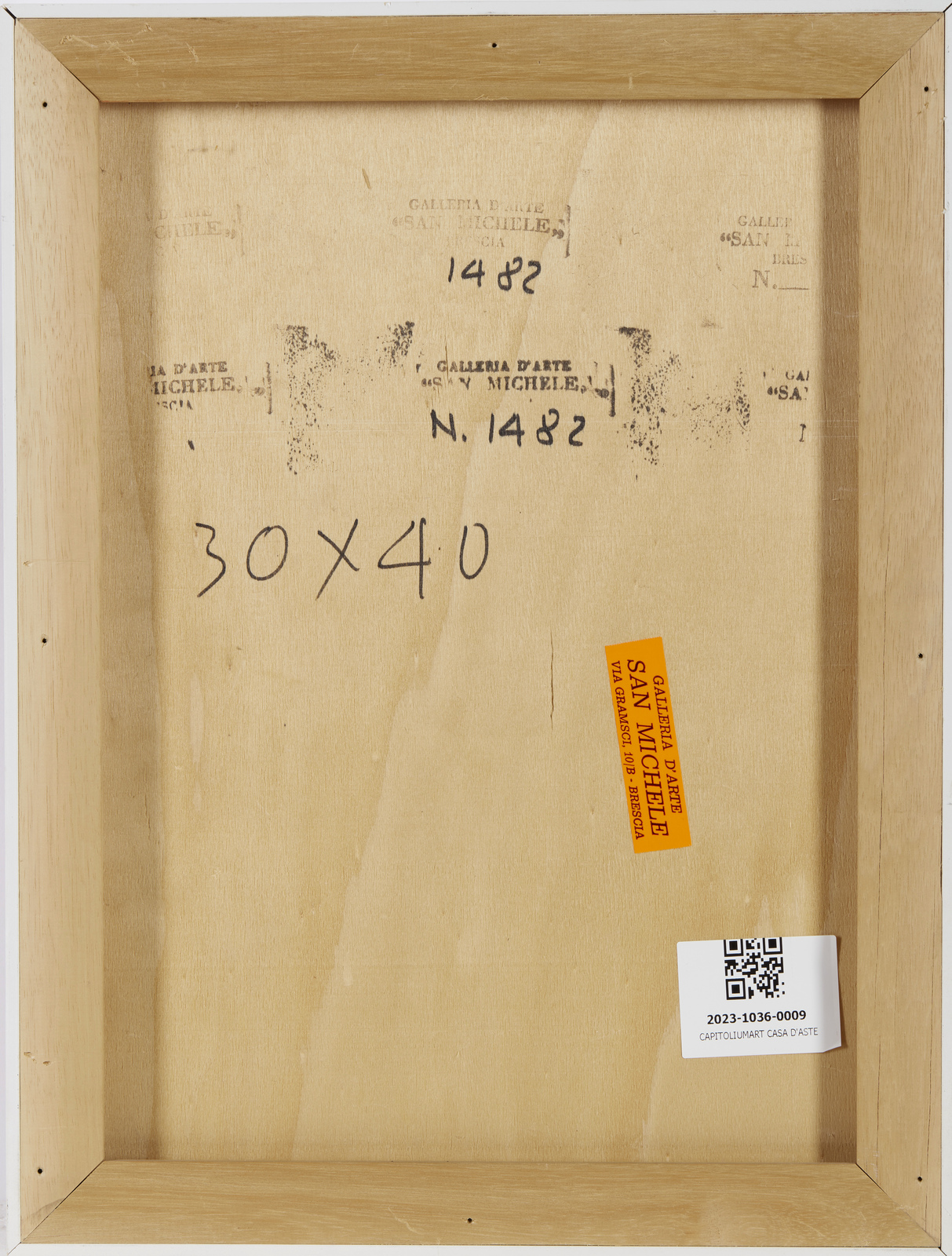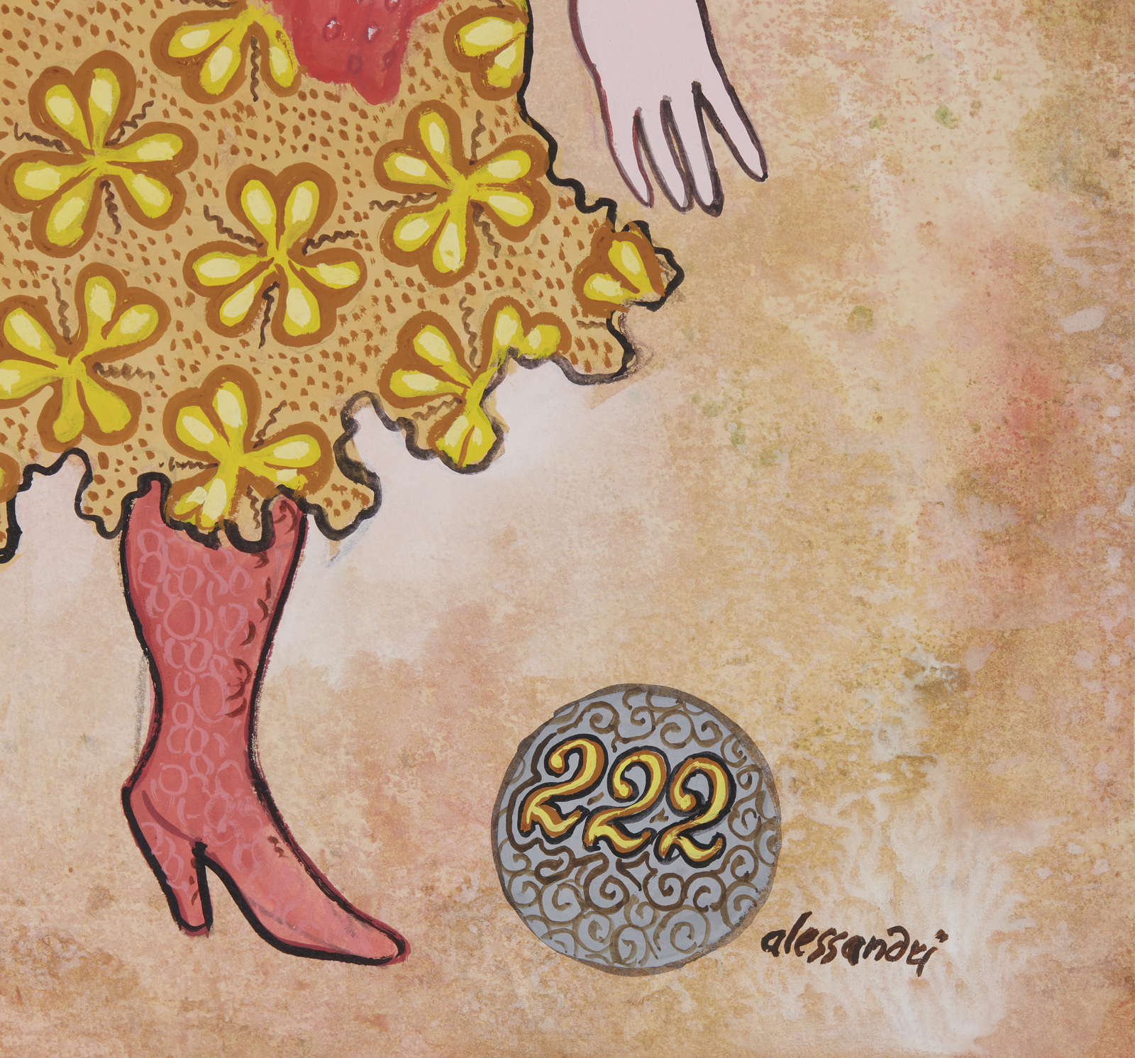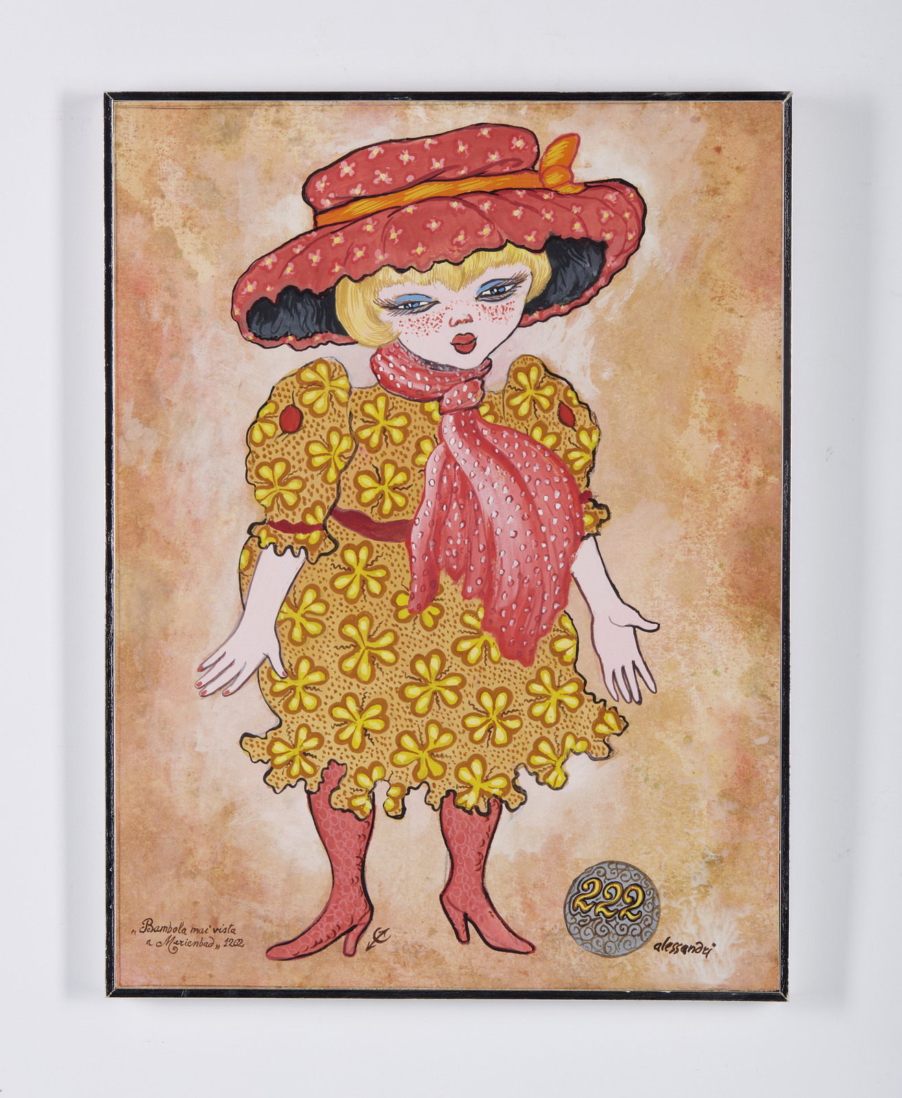 ALESSANDRI LORENZO (1927 - 2000) Bambola mai vista a Marienbad. Tecnica mista su tavola. Cm 30,00 x 40,00. Firma, titolo e anno in basso. Al retro timbro della Galleria d'arte San Michele, Brescia. Cornice presente