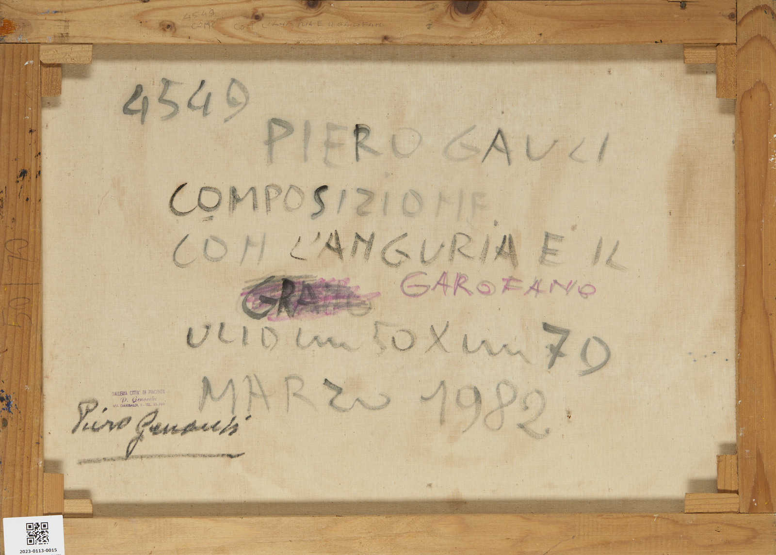 GAULI PIERO (n. 1916) Composizione con l'anguria e il garofano. 1982. Olio su tela . Cm 70,00 x 50,00. Firma in basso a destra. Al retro firma, titolo e data. Provenienza: Galleria Genocchi, Piacenza; Collezione privata, Parma.