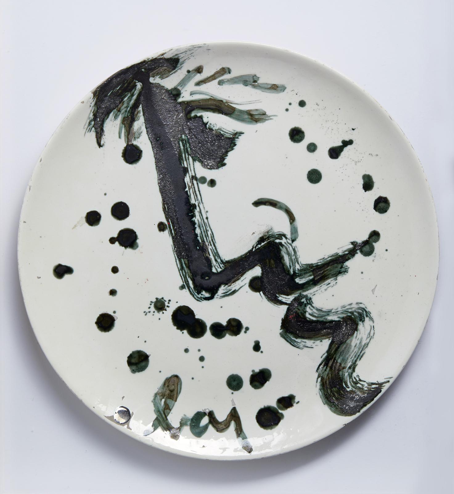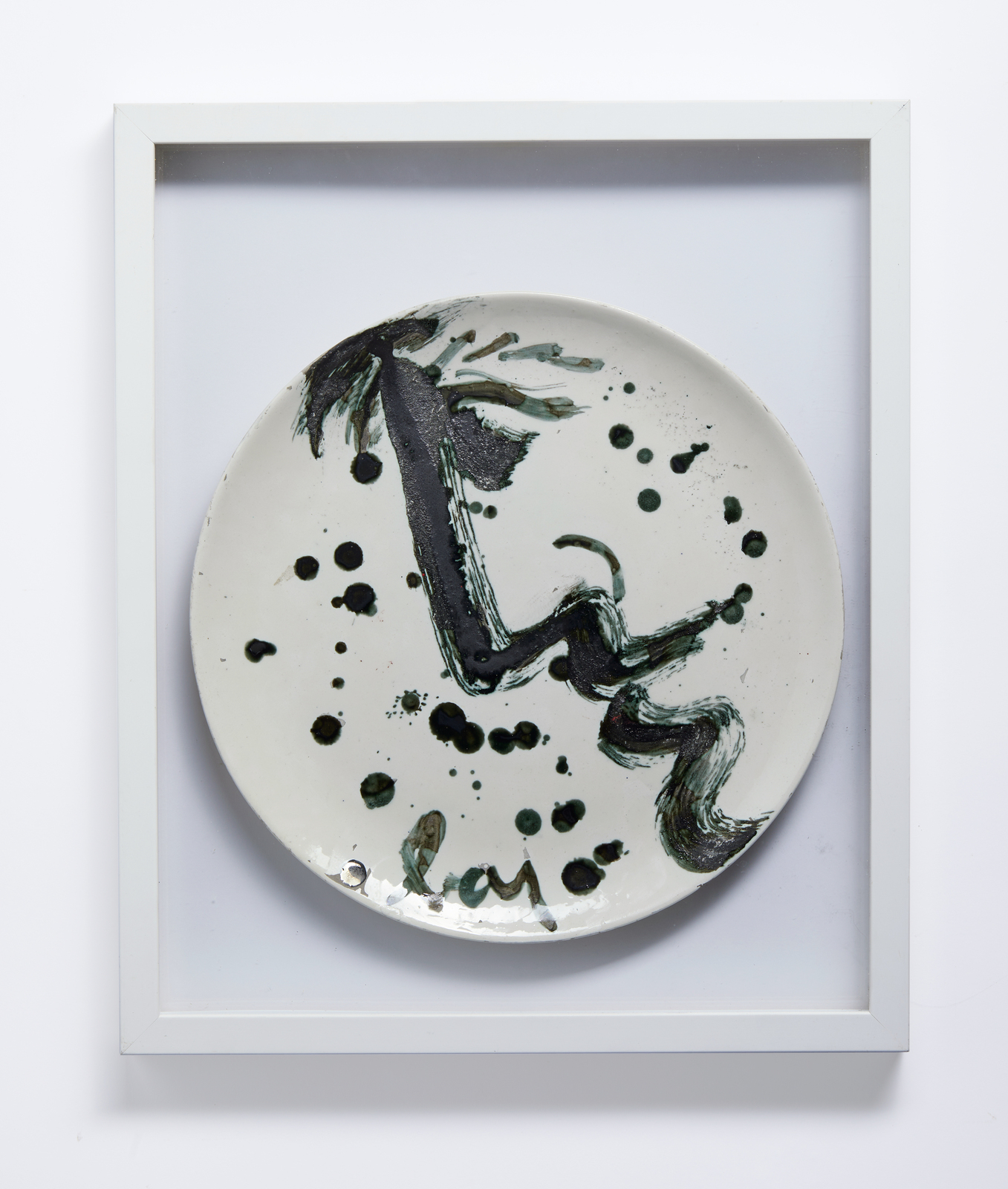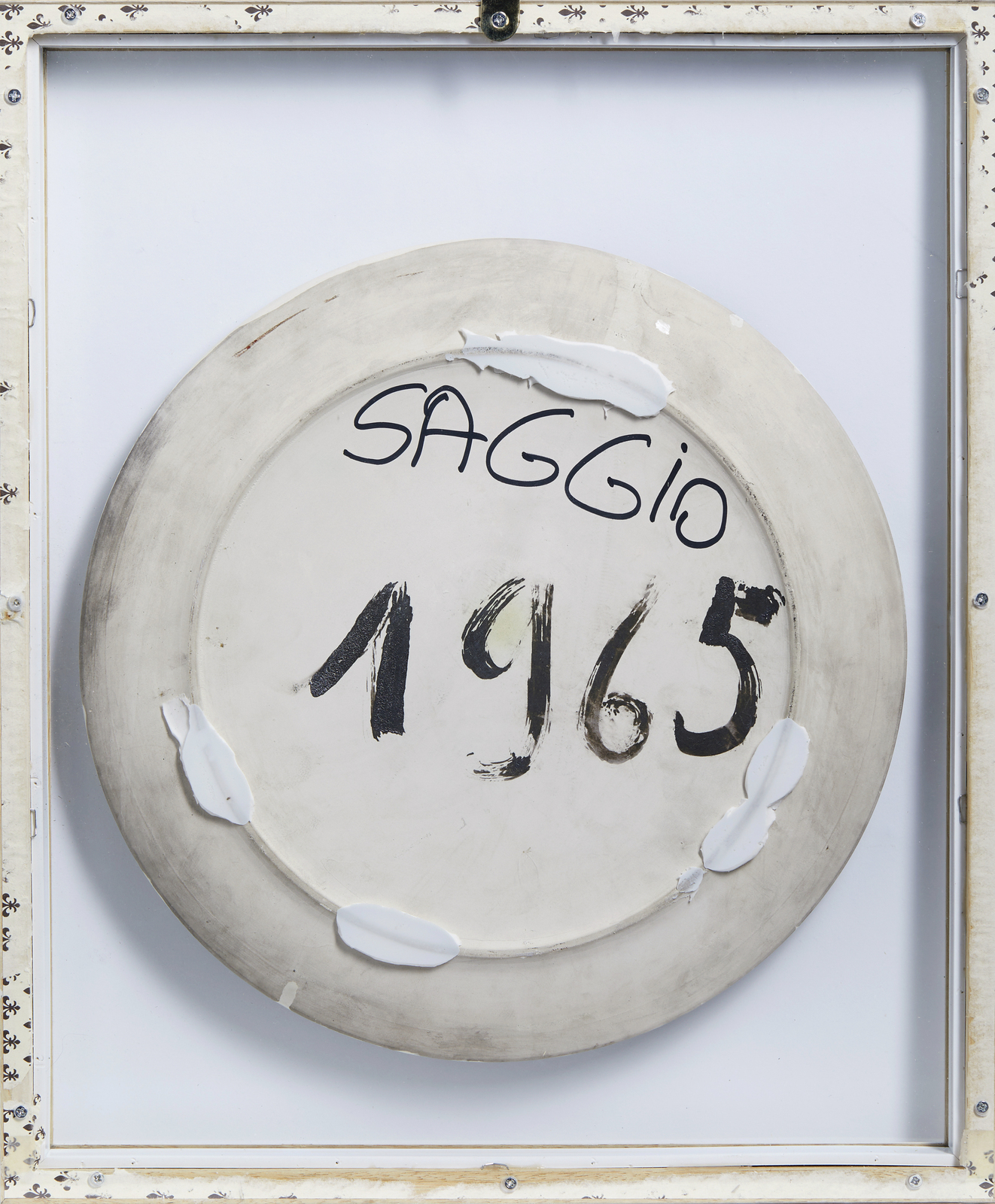 BAJ ENRICO (1924 - 2003) Saggio. 1965. Piatto in ceramica. Cm 33,00 x 33,00. Firma in basso al centro. Al retro titolo e anno. Autentica su fotografia a cura di Roberta Cerini Baj. Diametro: 33 cm. Provenienza: Collezione privata, Pavia. Cornice presente