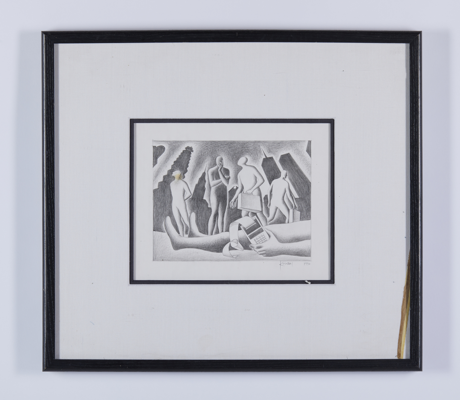 KOSTABI MARK (n. 1960) Study for miscalculation. . 1990. Tecnica mista su cartoncino. Cm 43,00 x 35,50. Firma e anno in basso a destra. Al retro titolo, firma e anno. Provenienza: Collezione privata, Como. Difetti. Cornice presente
