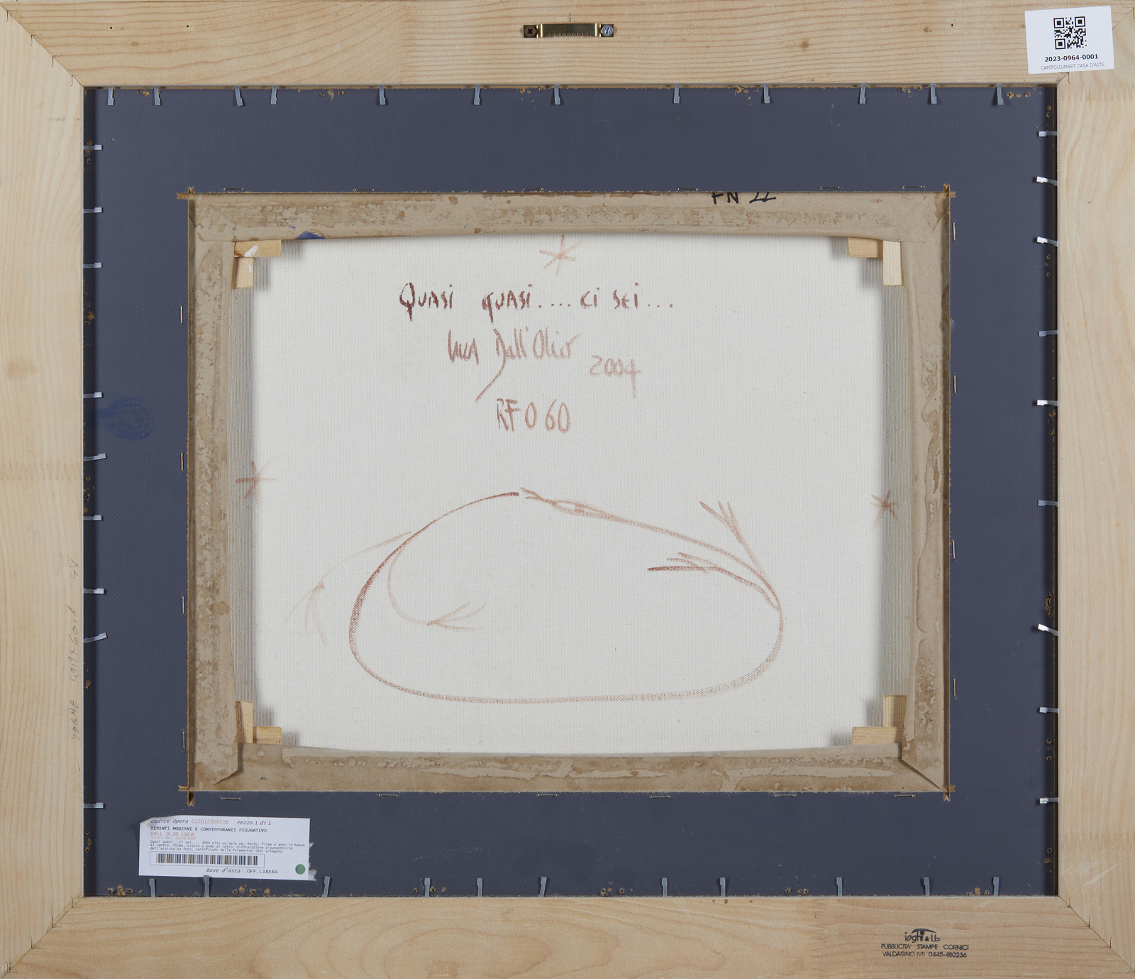 DALL'OLIO LUCA (n. 1958) Quasi quasi......ci sei. 2004. Olio su tela . Cm 50,00 x 40,00. Firma e anno in basso al centro. Al retro firma, titolo e anno. Autentica dell'artista su fotografia. Certificato di provenienza Telemarket, Brescia. Lievi difetti. Cornice presente