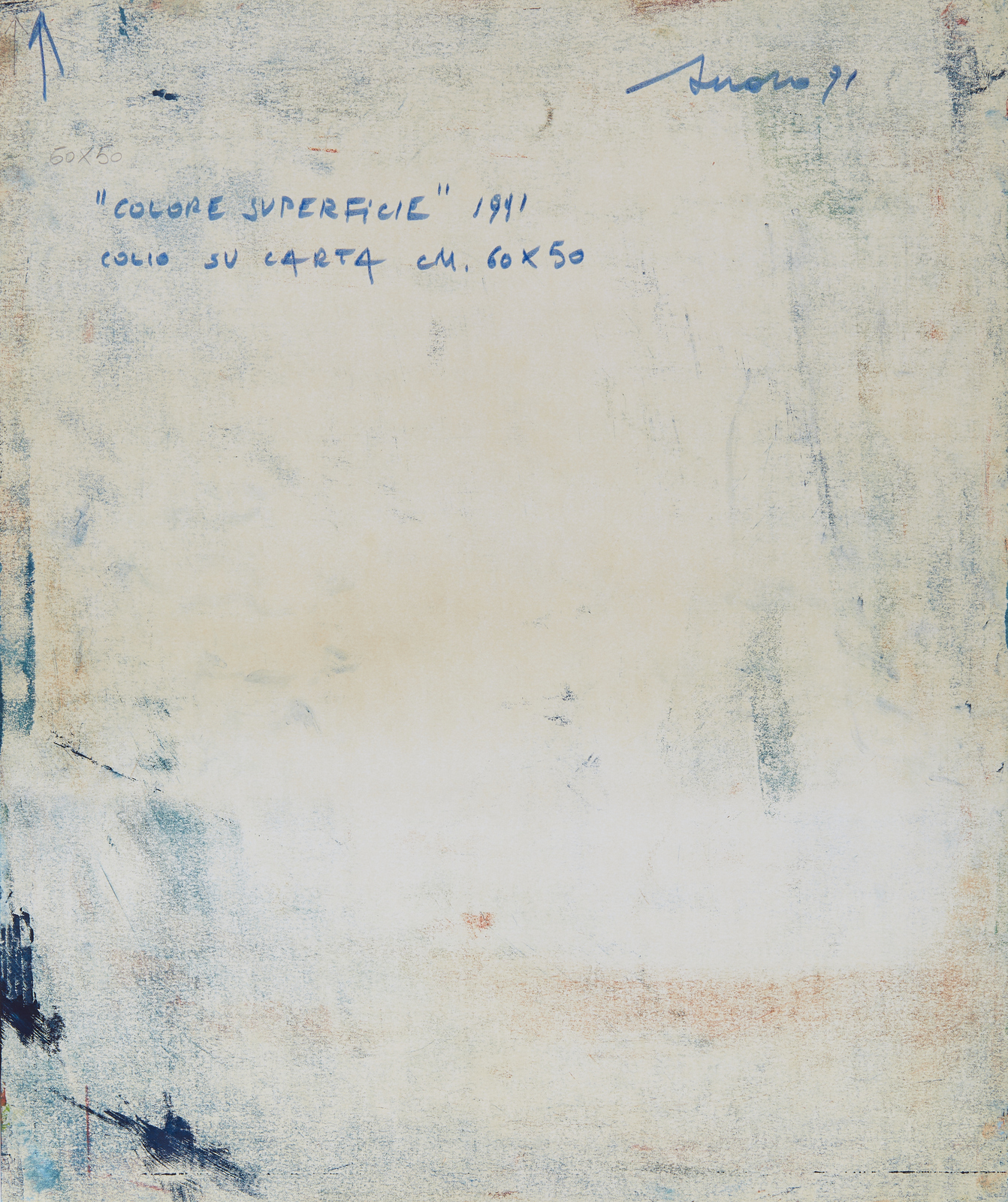 RUARO FRANCO (n. 1960) Colore superficie. 1991. Olio su carta. Cm 50,00 x 60,00. Al retro titolo, firma e anno. Provenienza: Collezione privata, Trento. Lievi difetti. Cornice presente