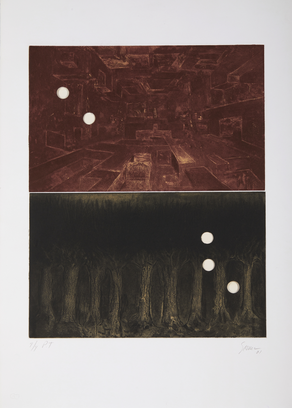 SESMA RAYMUNDO (n. 1954) Senza titolo. 2001. Acquaforte e acquatinta. Cm 49,50 x 70,50. 4/4. P.t. Tiratura, firma e anno in basso a matita. Timbro a secco Giorgio Upiglio in basso a sinistra. Dimensione lastra: 49x39.5 cm. Lievi difetti.