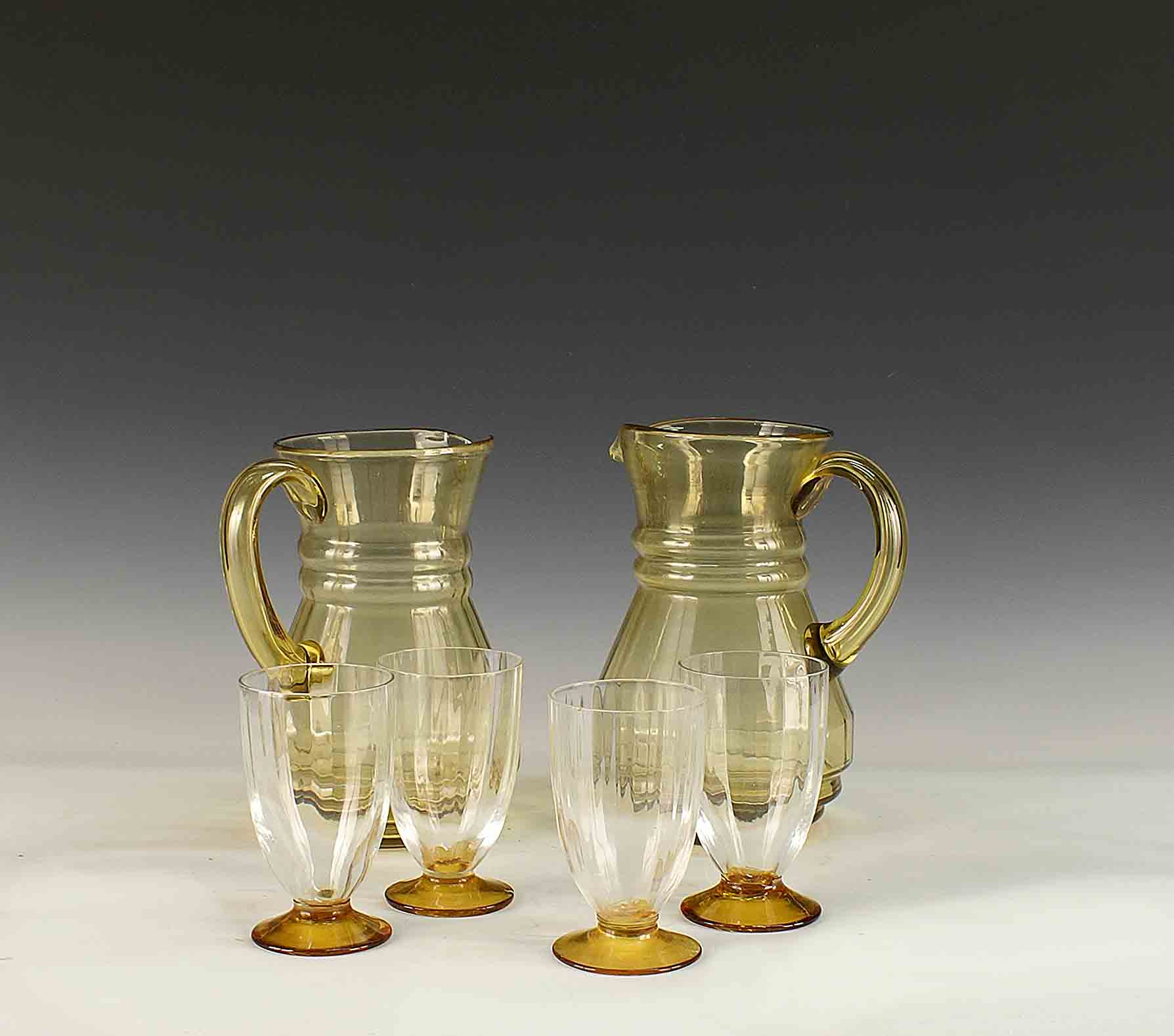Lotto composto da due caraffe in vetro colorato e nove bicchieri in vetro...