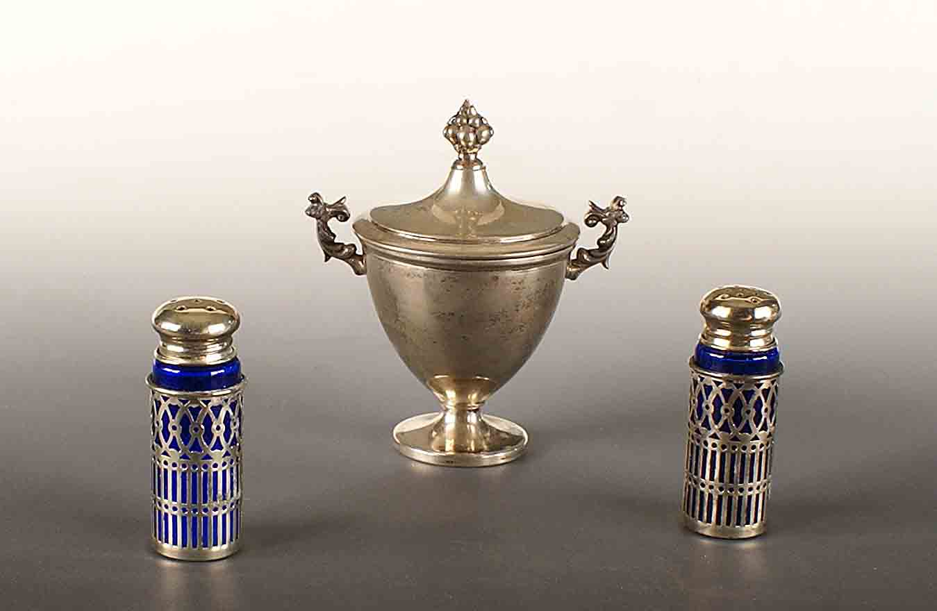 Lotto composto da una zuccheriera in argento, gr. 120 e una coppia di salierine in metallo e opalina.