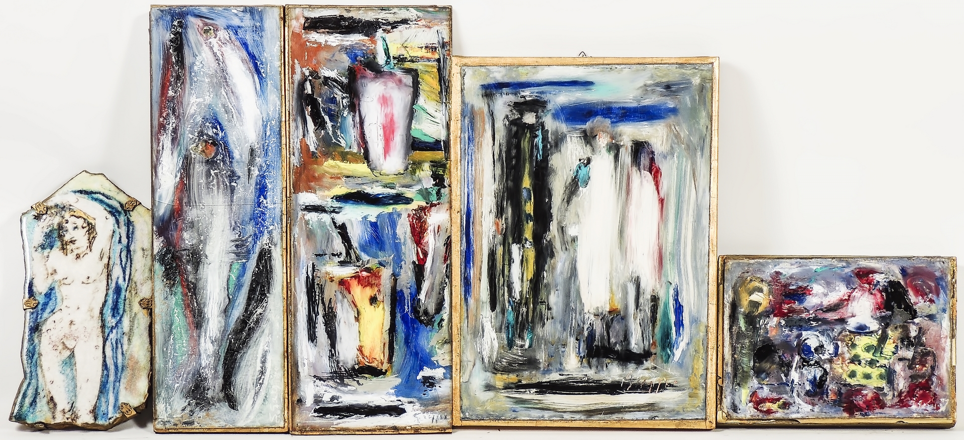 SPARTACO GREGGIO (1893-1979) Serie di quattro pannelli ad olio su vetro - four oils on glass ed una formella in terracotta dipinta con nudo femminile (5)