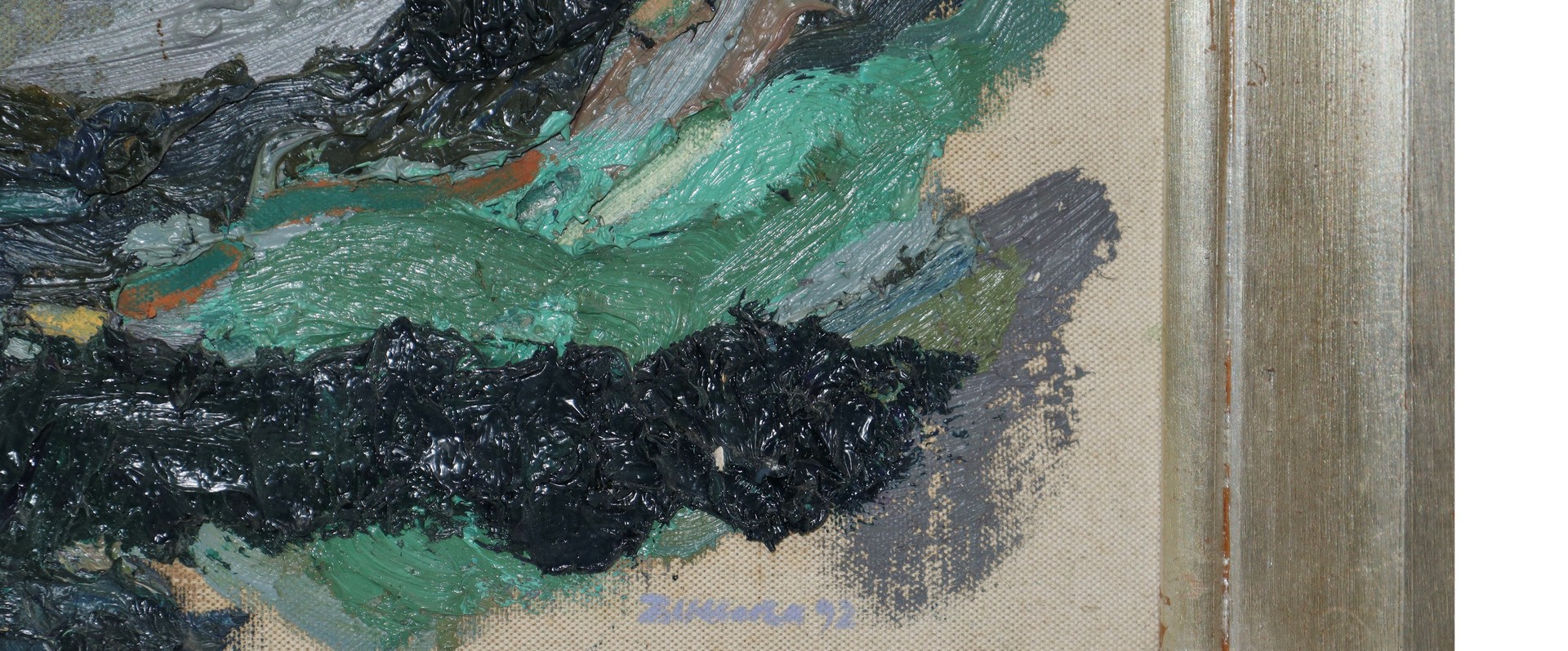Piero Zuccaro (Catania 1967) - Fichi d'india, 1999 cm 45x95 in cornice cm 56x106 Olio su tela Firma e titolo sul fronte in basso al destra. Firmato, titolato e datato sul retro.