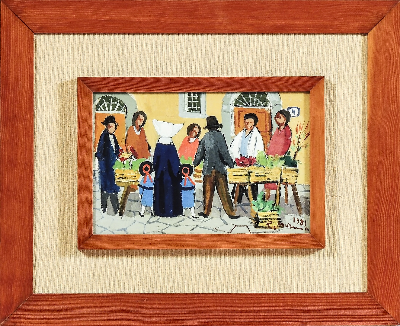 RODOLFO MARMA (1923-1999) Mercatino - Local Market olio su cartone telato - oil on canvas board, firmato e datato 1981, in cornice cm 20x30