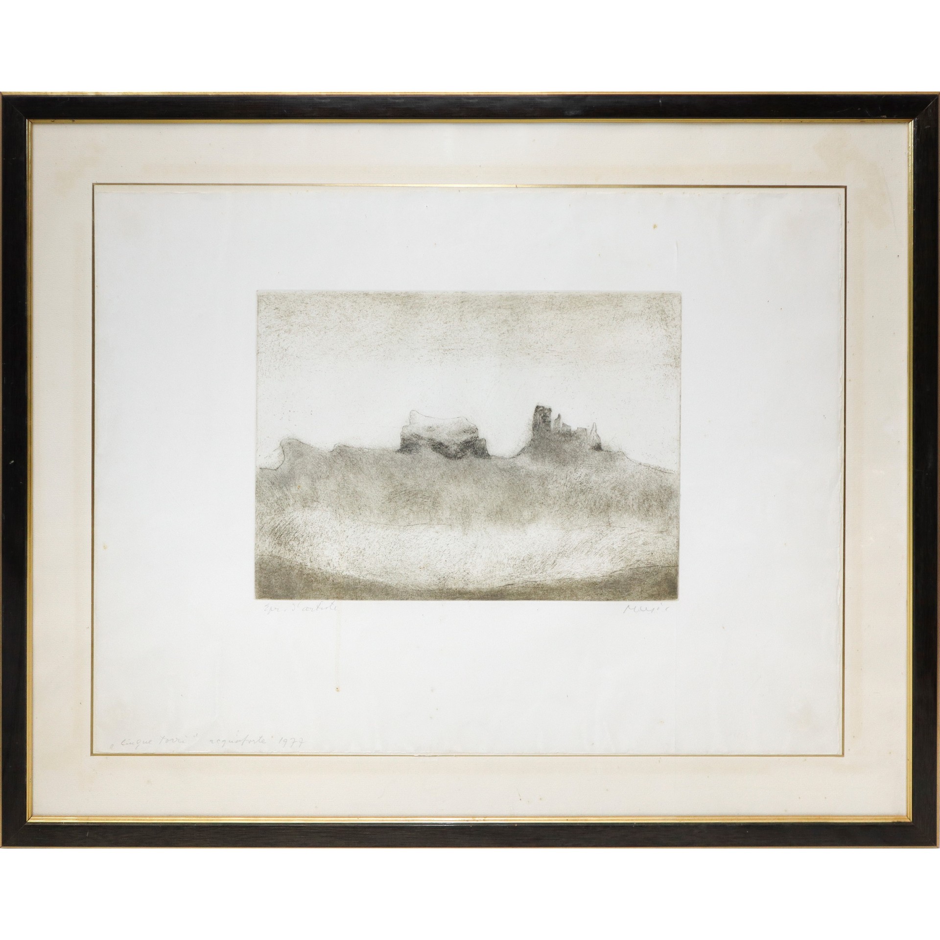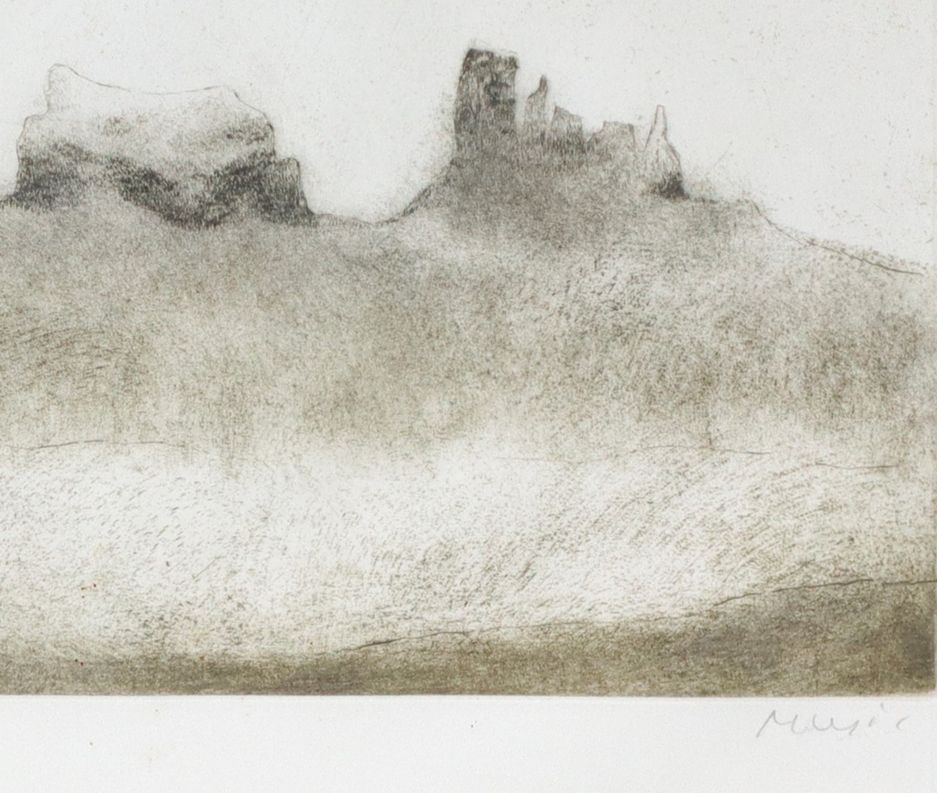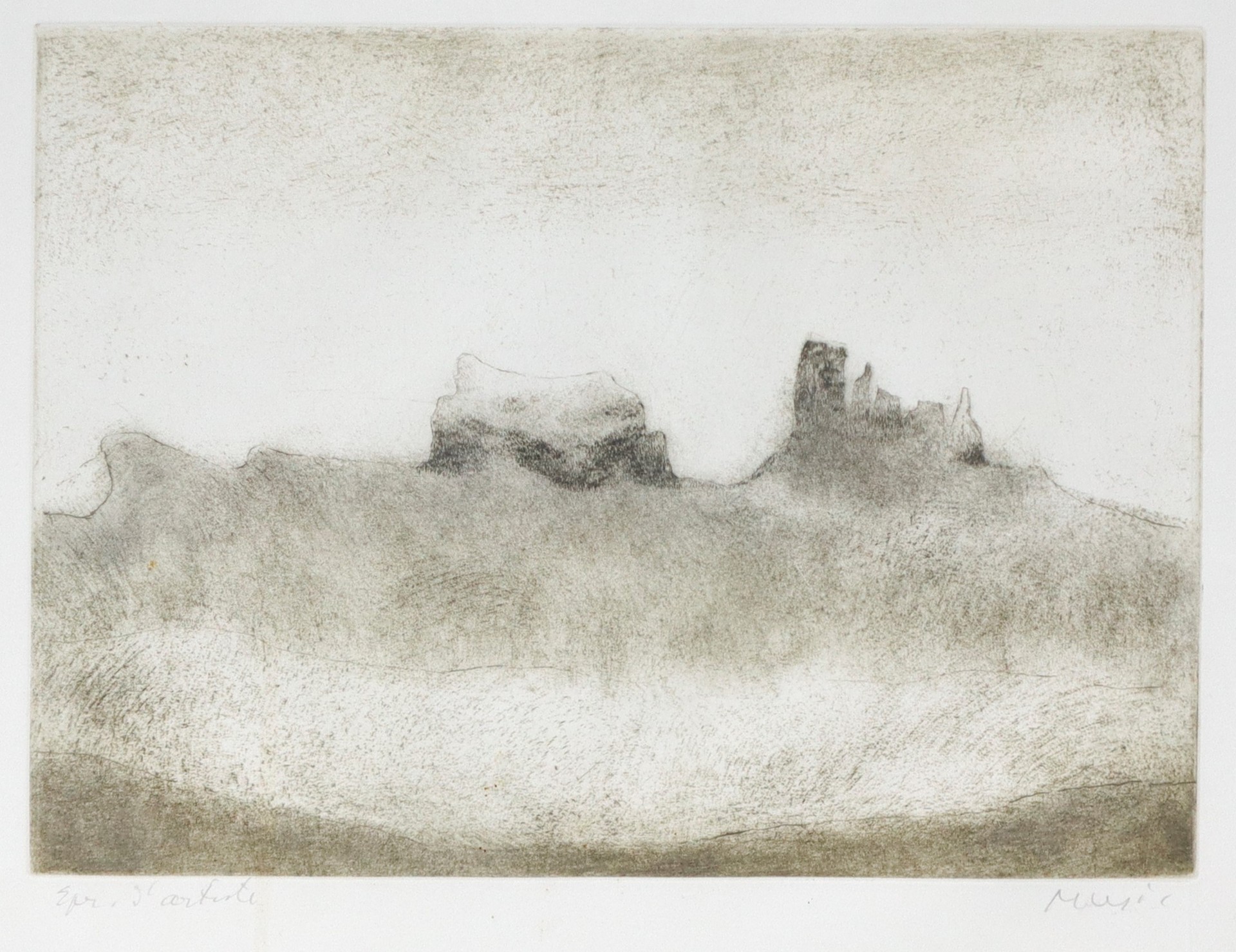 Anton Zoran Mušič (Boccavizza 1909-Venezia 2005) - Cinque torri, 1977 H cm 27,5x37 - in cornice H cm 67x82 Acquaforte Firmato in basso a destra, titolato e datato in basso a sinistra. Dedicato al retro.