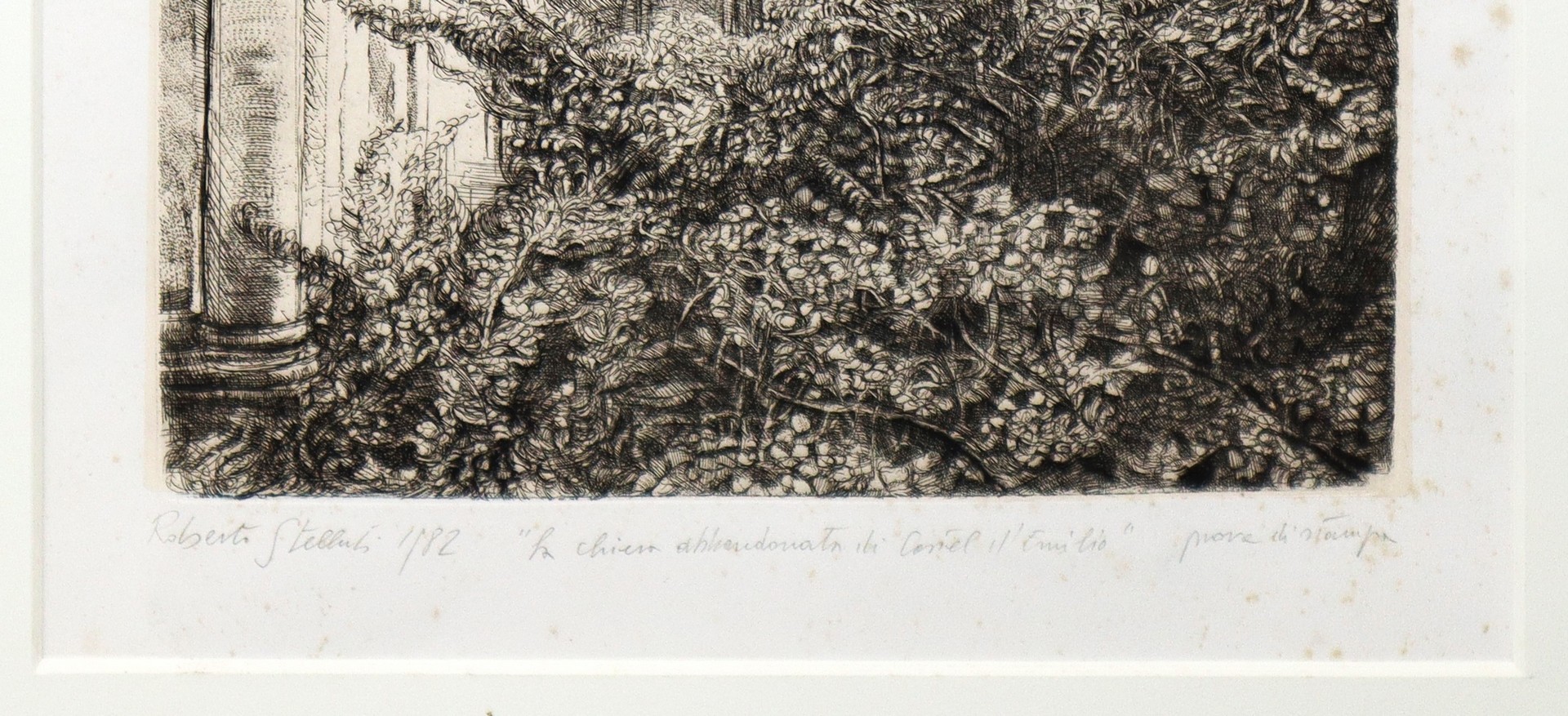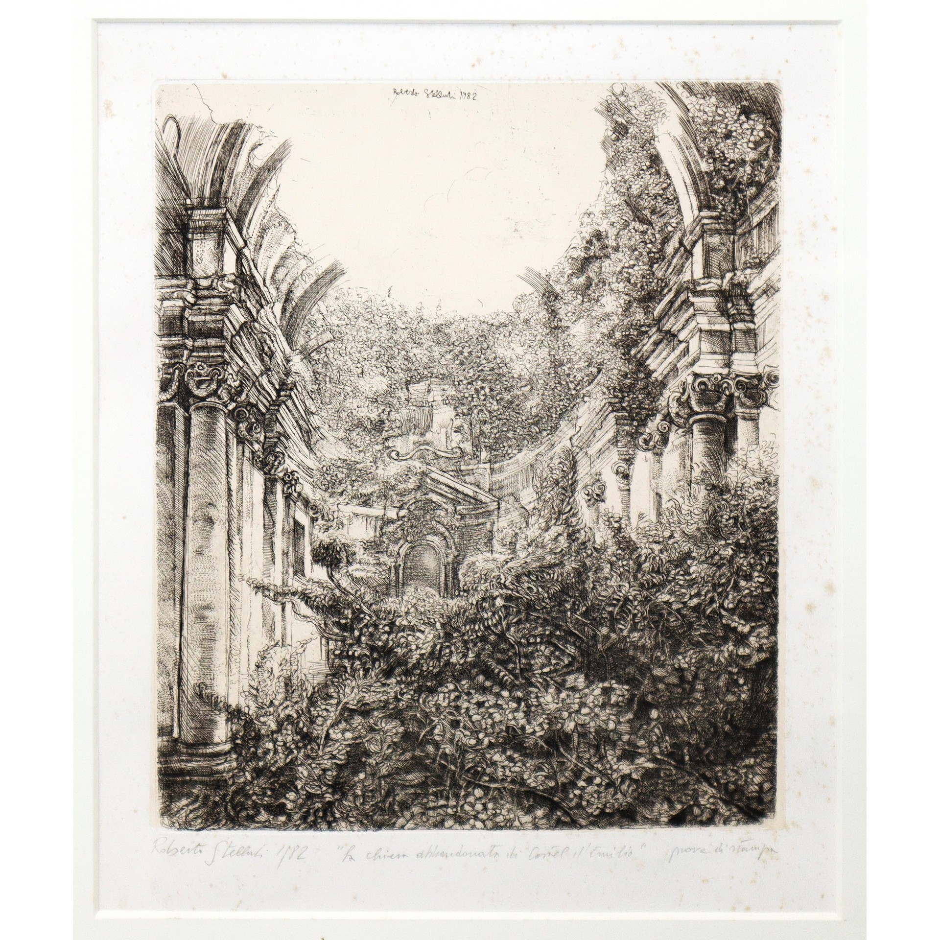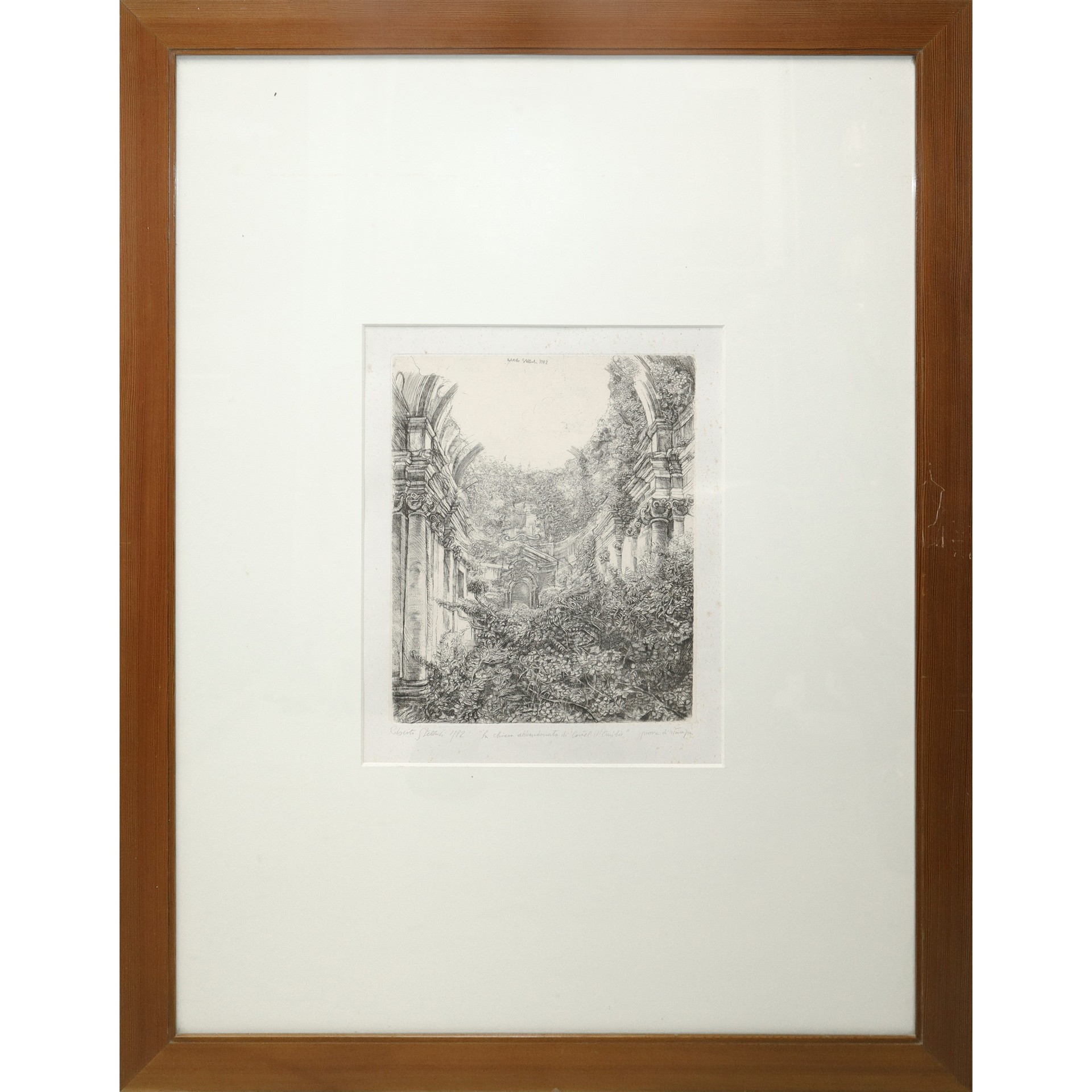 Roberto Stelluti (Fabriano 13/09/1951) - La chiesa abbandonata in Castel d'Emilio, 1992 H cm 35x28 - in cornice H cm 68x68 Firma, titolo e data sul retro.Firma, titolo e data sul retro.