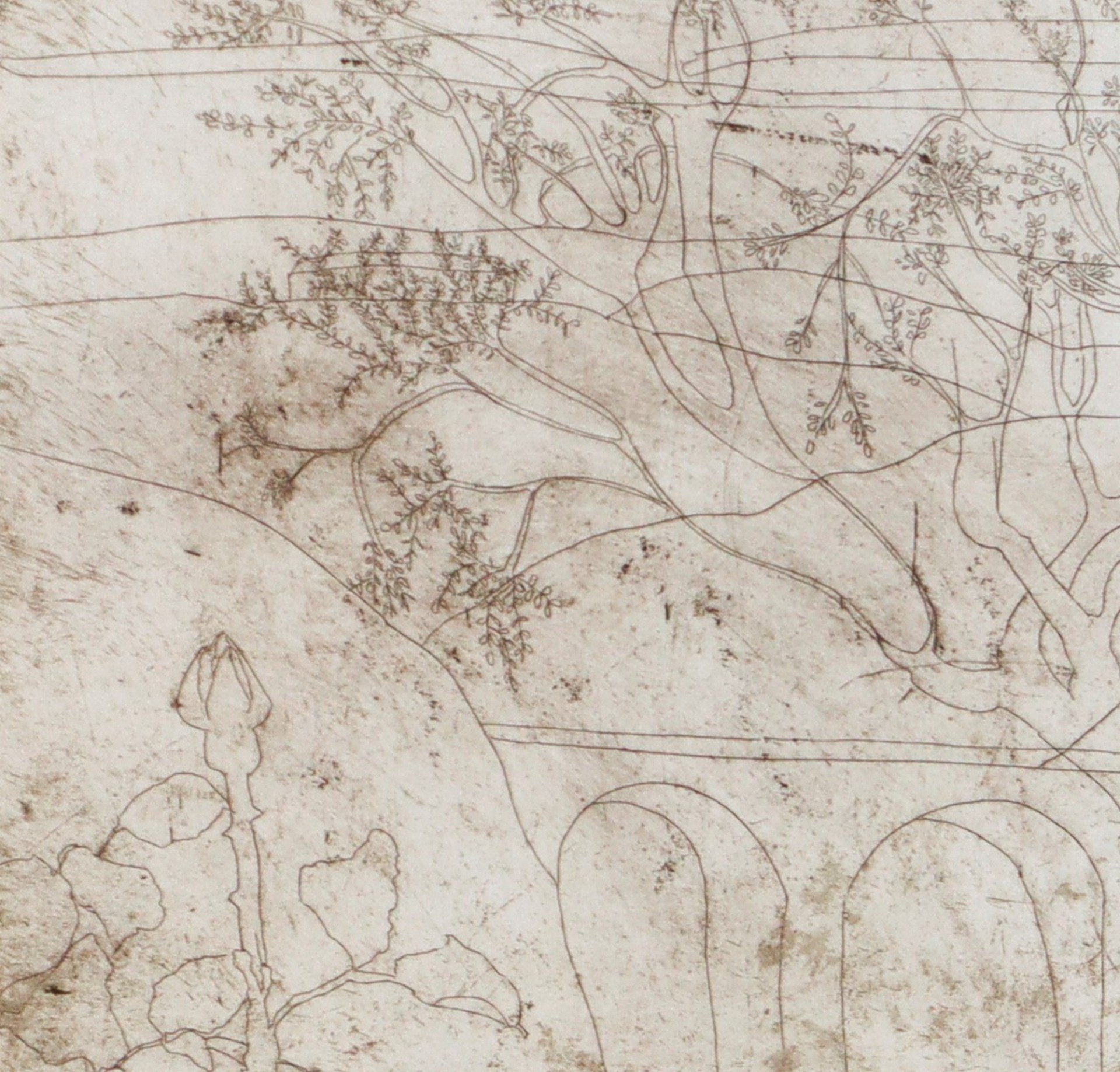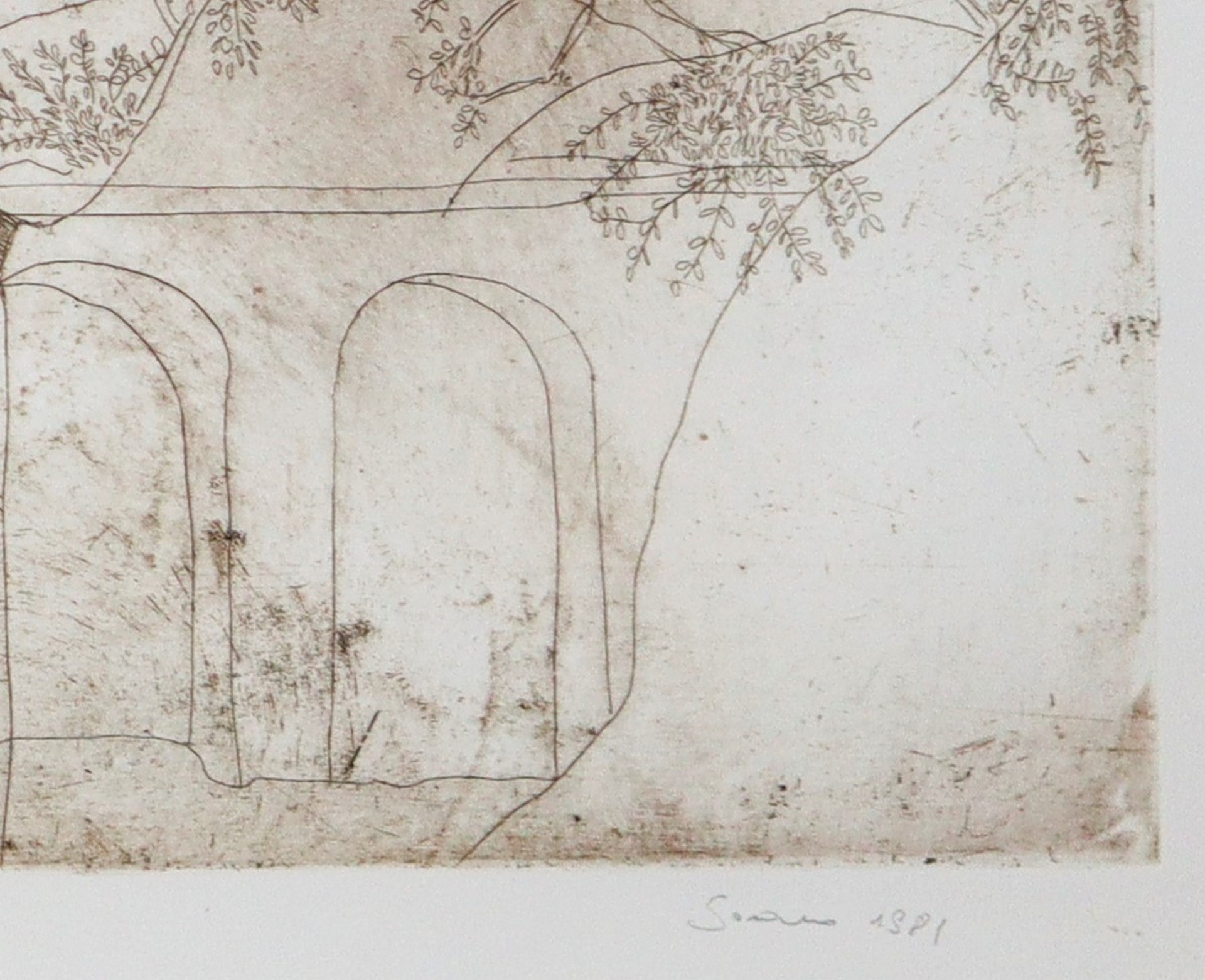 Giuseppe Sorano (Siracusa 1896-Siracusa 1968) - Paesaggio con ruderi, 1981 H cm 24x39,5 - in cornice H cm 51x71,5 Acquaforte Firmata e datata in basso a destra. Copia unica.