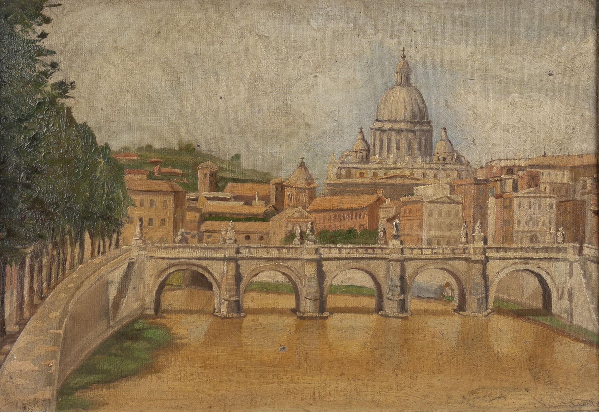 Carlo Socrate (Mezzanabigli 1889-Roma 1967) - Veduta del Tevere con San Pietro prima della demolizione della Spina di Borgo