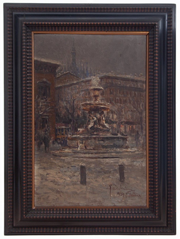 Lucio Todeschini Milano 1892 - Cortenova (LC) 1969 Piazza Fontana a Milano Olio su tavola cm 58x38