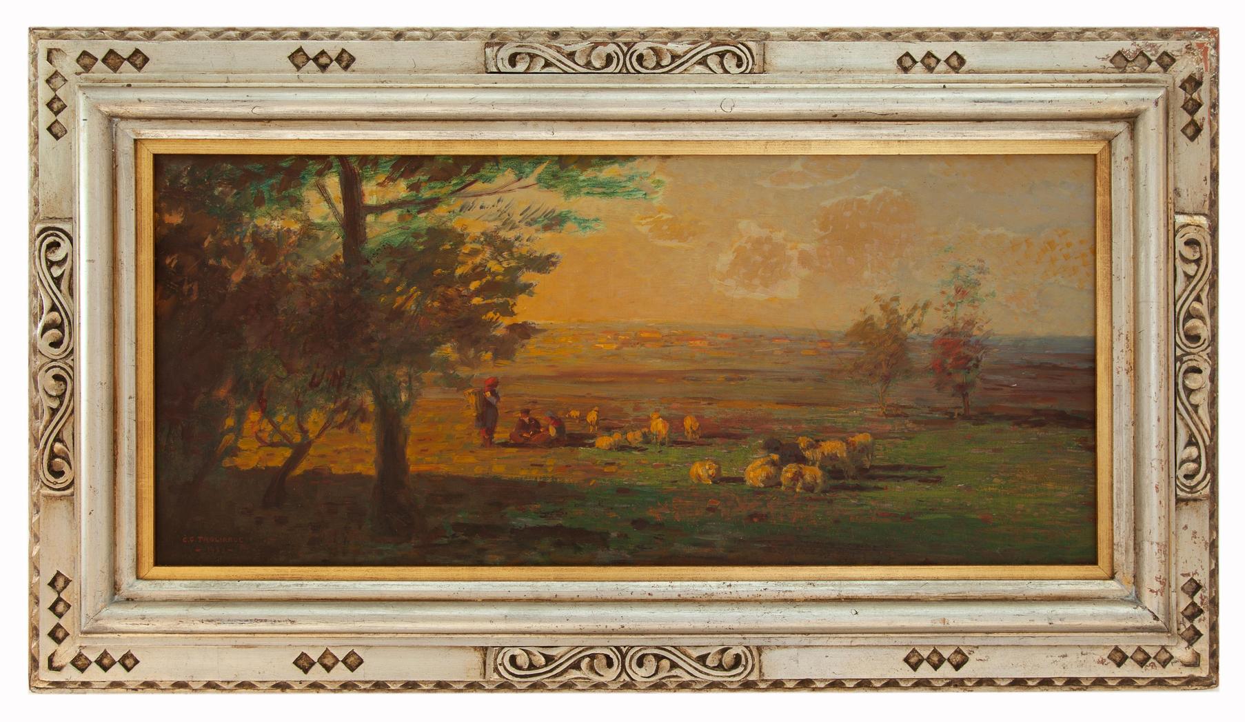 Carlo Costantino Tagliabue Bresso (MI) 1880 - Milano 1960 Pascolo Olio su tela cm 41,5x92 Il pittore Carlo Costantino Tagliabue e' nato ad Affori (Milano) nel 1880 e morto a Milano nel 1960. Appreso il disegno nelle Scuole di decorazione di Milano, fu dapprima decoratore, poi copista nelle varie pinacoteche e gallerie studiando e riproducendo prevalentemente i maestri dell'antichita'. Dopo queste esperienze, si dedico' soltanto al paesaggio ed alle marine. Esordi' alla Permanente milanese, nel 1905; poi partecipo' frequentemente alle Biennali di Brera e ad altre esposizioni nazionali. Predilige il paesaggio di montagna, che rende con tendenza segantiniana, e due lavori di questo genere sono stati acquistati dalla Banca Commerciale Italiana; alcune marine, fra le quali "La mareggiata" furono acquistate dal Re. Altri dipinti sono conservati in Italia ed all'estero, presso enti e privati. Citansi di lui anche "Sotto le nubi", e parecchi affreschi di carattere religioso. Alla Galleria d'Arte Moderna di Milano esistono: "Notturno" e "Plenilunio a Venezia". Note biografiche tratte dal Dizionario Illustrato dei Pittori, Disegnatori ed Incisori Italiani A.M. Comanducci.