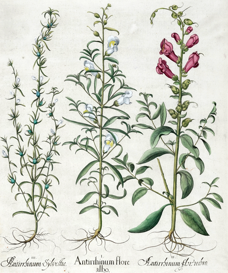 Basilius Besler, Quattro tavole da Hortus Eystettensis. 1613. Bulino, tempera e acquerello a colori. mm 470/472x390/394. Foglio: mm 505/520x405/410. 1) Antirrhinum flore albo, Antirrhinum Sylvestre, Antirrhinum flore rubro; 2) Martagon Pomponeum, Palma Christierecta flore candido, Palma Christierecta flore variegato; 3) Nymphaea lutea, Nymphaea alba minor, Nymphaea alba miaior. 4) Iris bulbosa anglicana flore coeruleo, Iris bulbosa angustifoliis flore albo, Iris bulbosa angustifoliis lutea mixta. Da Hortus Eystettensis. Bellissime prove, stampate su carta vergellata con filigrana "pigna di Augsburg" visibile su due fogli, dall'edizione di lusso del 1613 priva di testo al verso. (4)