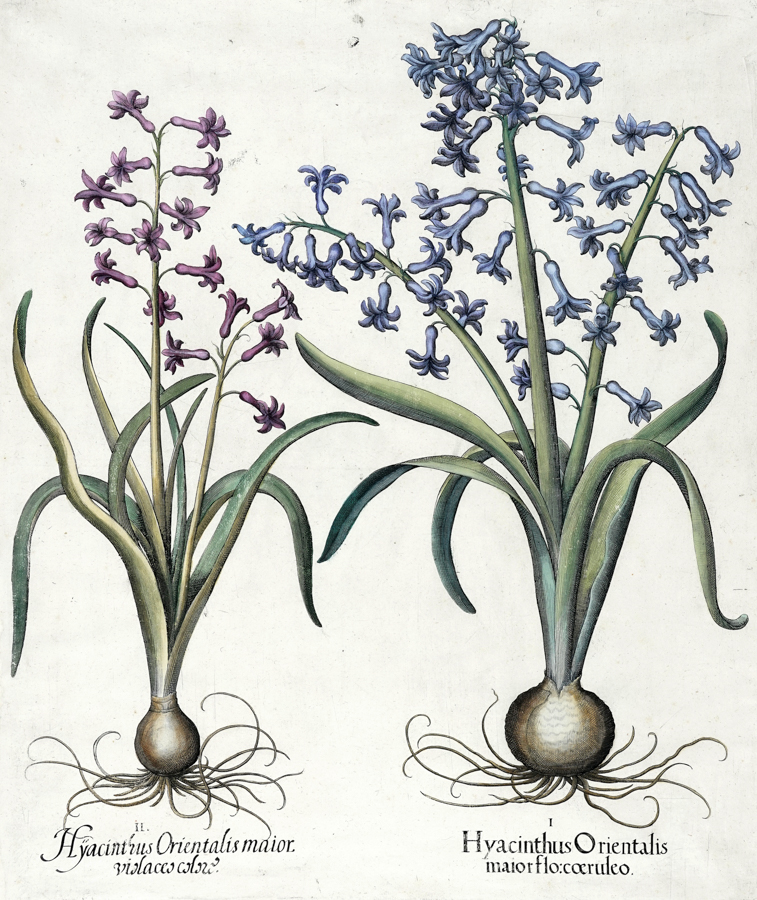 Basilius Besler, Quattro tavole da Hortus Eystettensis. 1613. Bulino, tempera e acquerello a colori. mm 470/472x390/394. Foglio: mm 505/520x405/410. 1) Hedysarum Clypeatum..., Onobrychis Dodon flore rubro, Botriis; 2) Hyacinthus Anglicus, Hyacinthus Anglicus flore incarnato, Hyacinthus Anglicus colore violaceo; 3) Hyacinthus Orientalis maiorflo:coeruleo, Hyacinthus Orientalis maior violaceo colore. 4) Limonium Syriacum, Calamentha Angustifoliis, Coronopus. Da Hortus Eystettensis. Bellissime prove, stampate su carta vergellata con filigrana "serpente" visibile su tutti i fogli, dall'edizione di lusso del 1613 priva di testo al verso. (4)