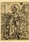 Lucas Cranach (il Vecchio), San Giorgio. 1506. Xilografia. mm 380x280. Bartsch, VII, 67. Hollstein, 83. Con il monogramma "LC" e la data "1506" sulla pietra verso il basso a destra. Buona prova nel III stato su 3 con la parte superiore dello stemma a sinistra rimossa dal blocco, impressa ancora con pienezza di dettaglio su carta vergellata sottile priva di filigrana. (1)