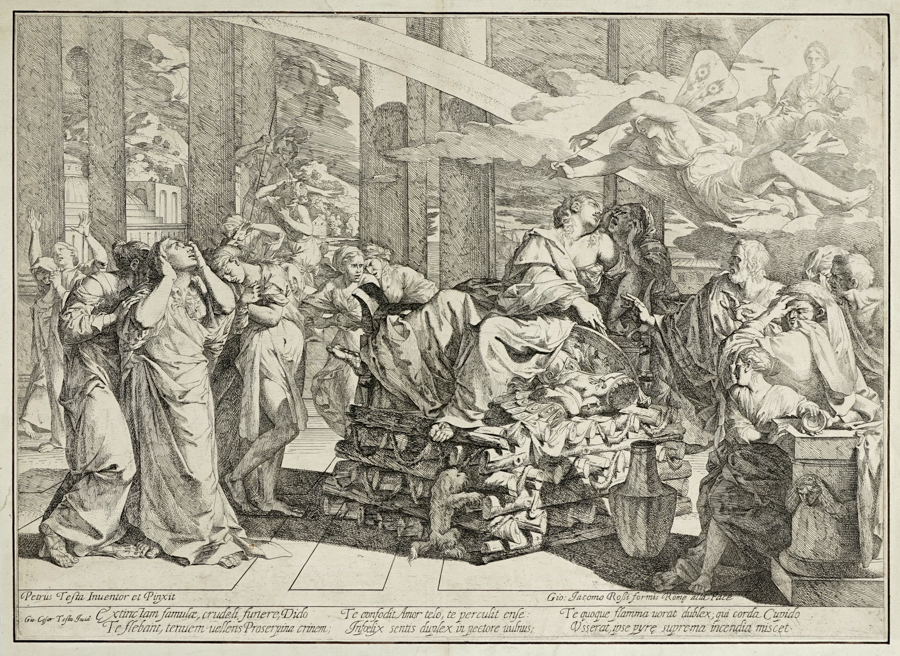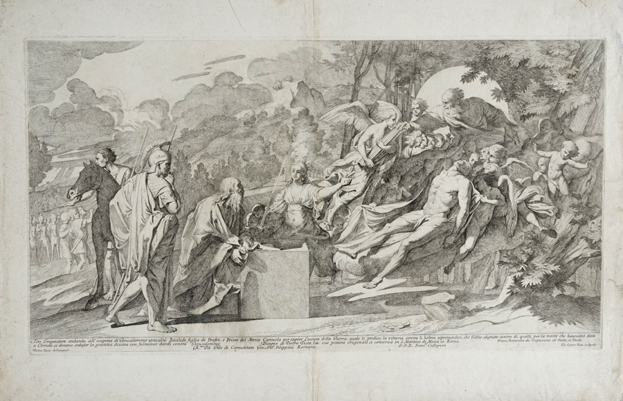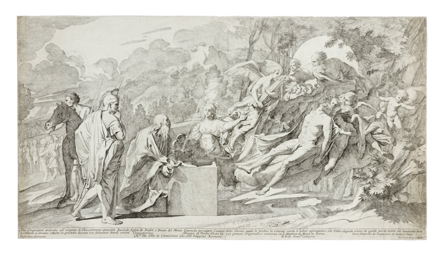 Giovanni Cesare Testa, La profezia di Basilide. 1650 ca. Acquaforte. mm 378x700. Foglio: mm 512x770. Cropper, 111. Al margine inferiore la firma di Giovanni Cesare e l'indirizzo di Collignon, poi un'iscrizione, aggiunta da Giovanni Cesare o dall'editore, che dedica la stampa a Giovanni Antonio Filippini (priore carmelitano di San Martino ai Monti, eletto nel maggio 1648, che aveva commissionato il dipinto di questo soggetto a Pietro Testa) e illustra la storia rappresentata. Ottima impressione nell'unico stato su carta vergellata pesante con filigrana "fiore di giglio in doppio cerchio". SI AGGIUNGONO: Id., Id., mm 377x690. Cropper, 111. Bella prova su carta vergellata pesante con filigrana "giore di giglio in cerchio singolo sormontato da lettera C". / Id., Il suicidio di Didone. Cropper, 125. Acquaforte. mm 330x458. Sulla lastra in basso a sinistra "Petrus Testa Inventor et Pinxit" e verso destra "Gio: Jacomo Rossi formis Romae alia Pace", al margine inferiore la firma di Giovanni Cesare e iscrizione su tre colonne. (3)